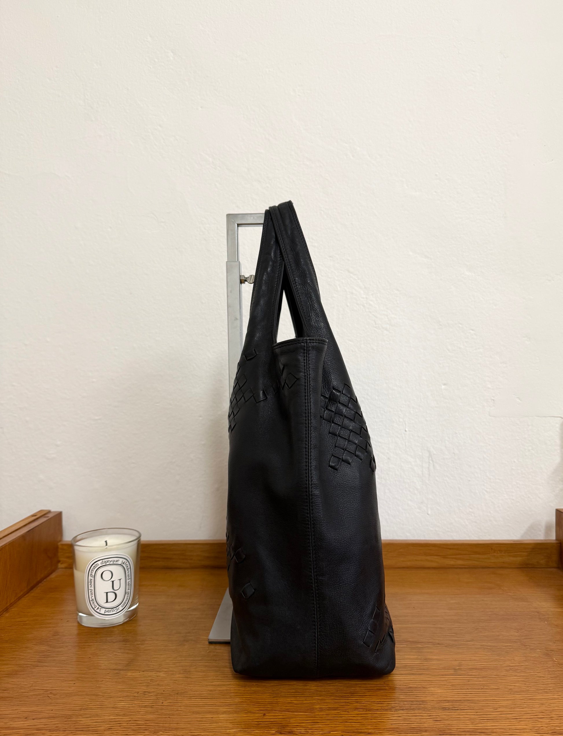 Prostorná Bottega Veneta tote bag z hladké černé kůže s decentním intrecciato motivem. Ideální na denní nošení – pojme všechny nezbytnosti včetně dokumentů či menšího notebooku. Nadčasový každodenní kousek, který se hodí k jakémukoli outfitu.