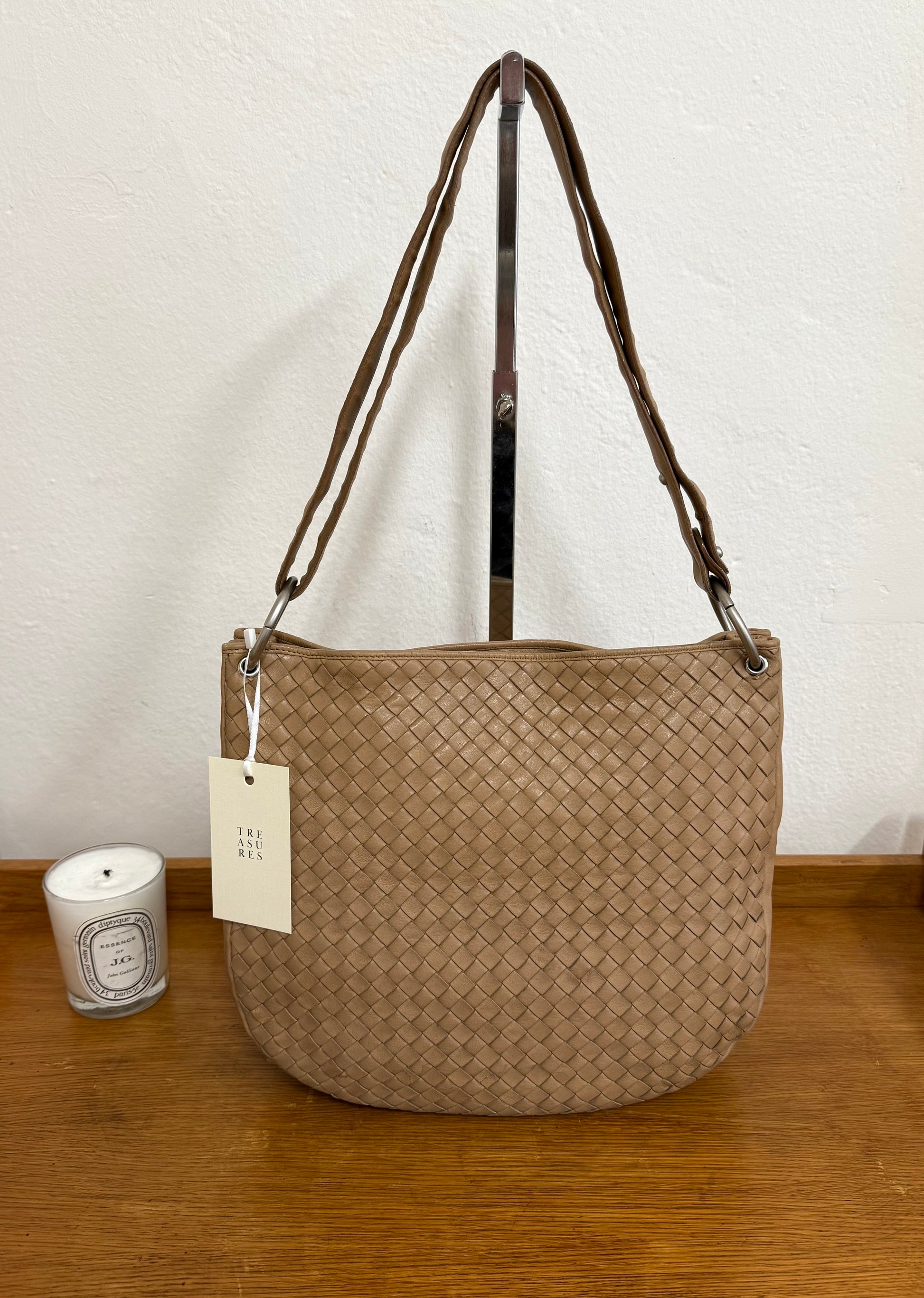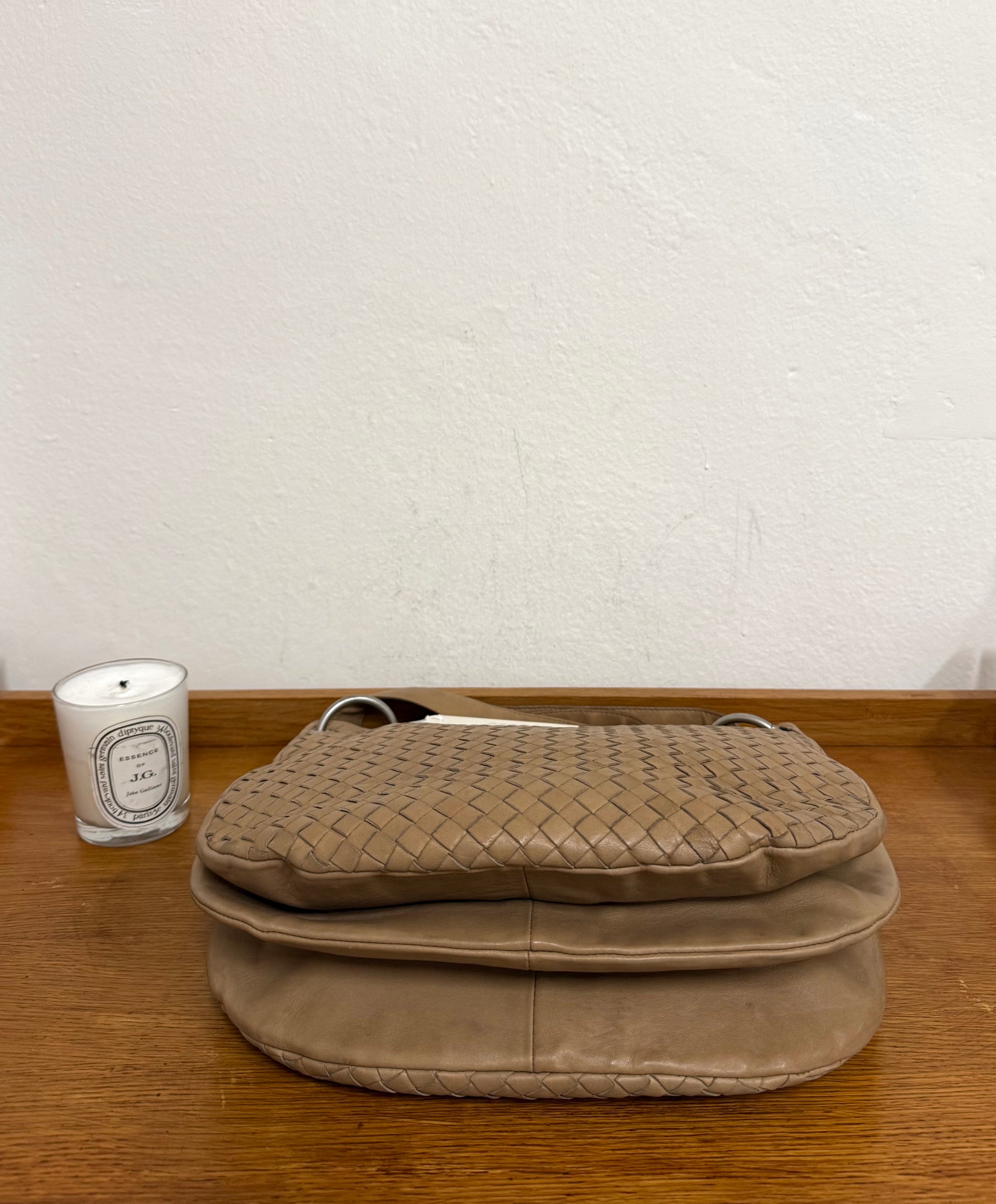 Nádherná Bottega Veneta Intrecciato shoulder bag z jemné jehněčí kůže v krásném světle hnědobéžovém odstínu. Měkká, hebká kůže a precizní proplétání pásků.