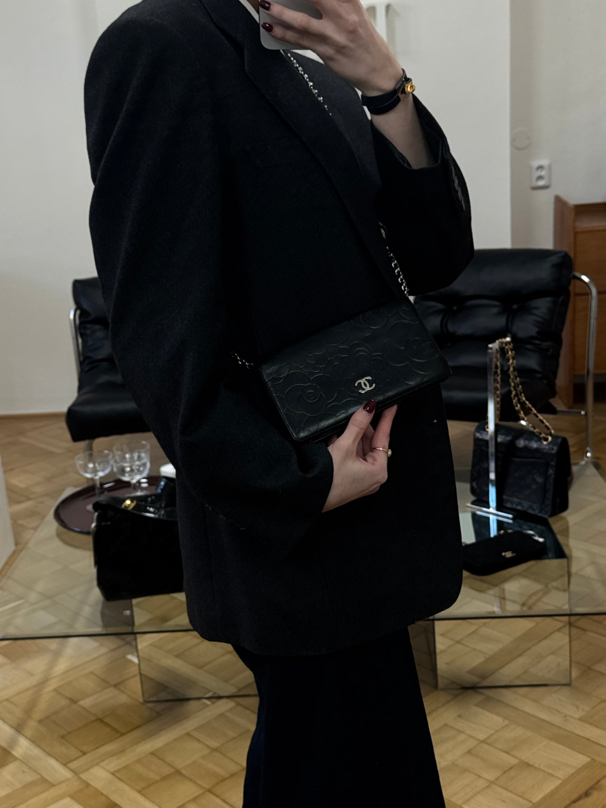 Chanel Camellia peněženka z černé kůže ze série 11 s ikonickým květinovým motivem. Nadčasový, elegantní kousek v klasické černé barvě, který vyniká jemným reliéfním vzorem camellia – symbolem značky Chanel. Lze nosit jako stylové psaníčko na řetízku nebo jako klasickou peněženku do kabelky.