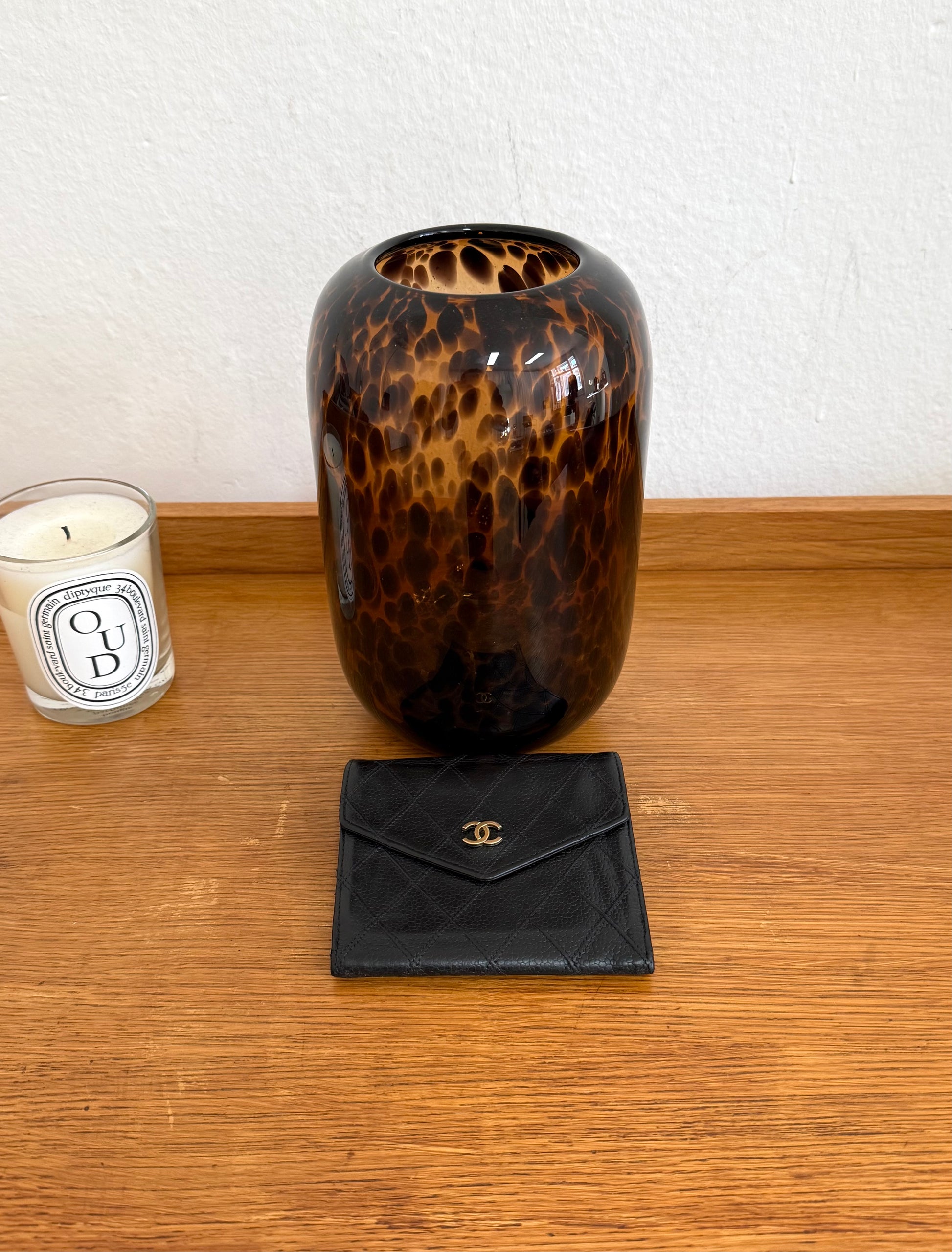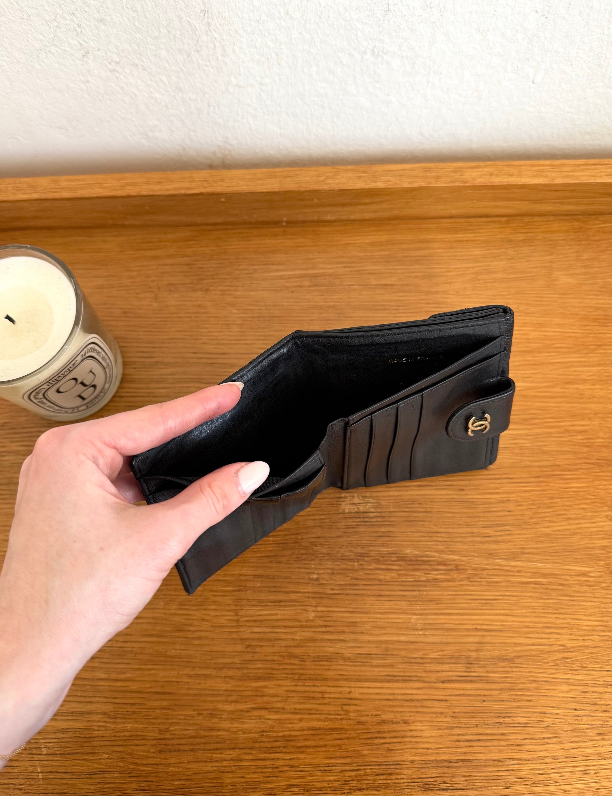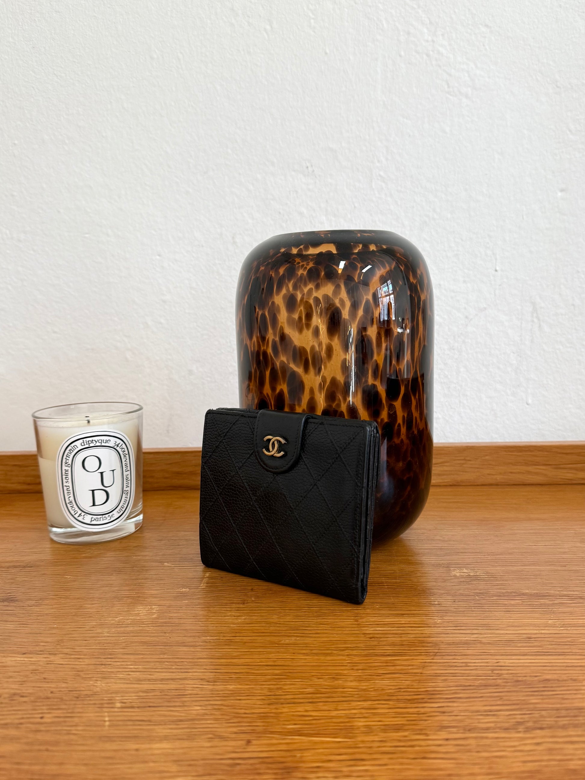 Nádherná Chanel double-sided peněženka z odolné caviar kůže se zlatým hardwarem. Stylový, kompaktní kousek, který lze nosit na řetízku jako elegantní doplněk nebo jako klasickou peněženku do kabelky.