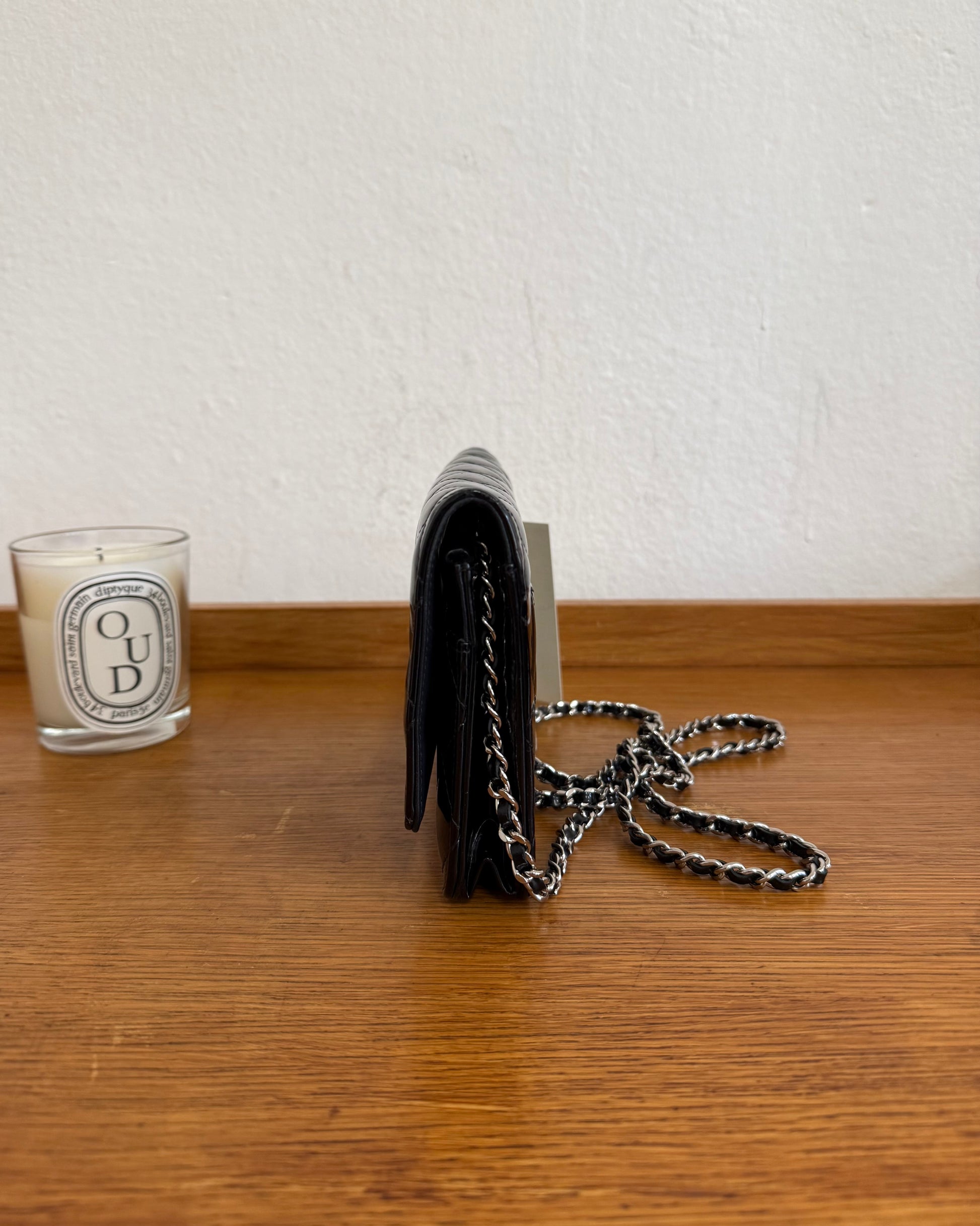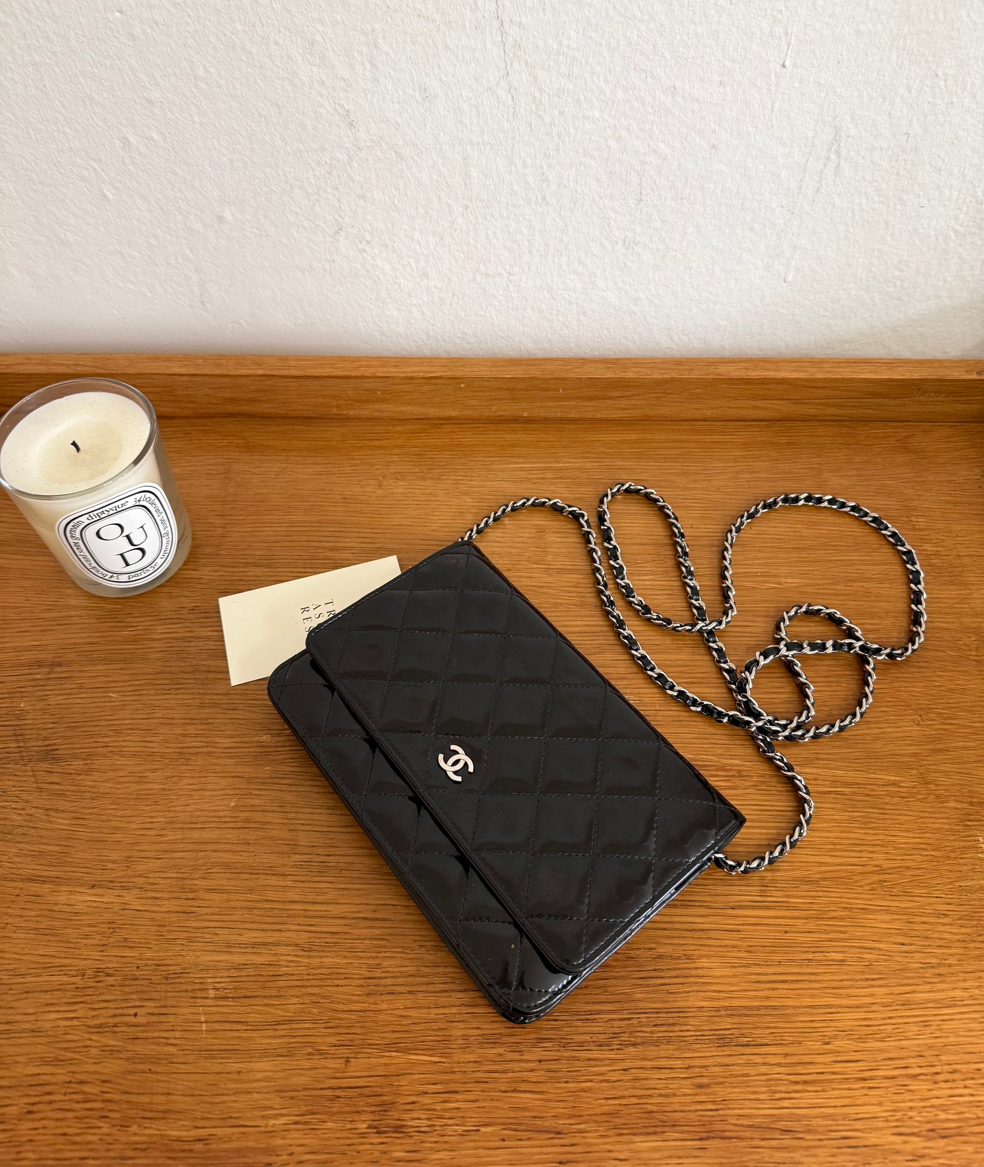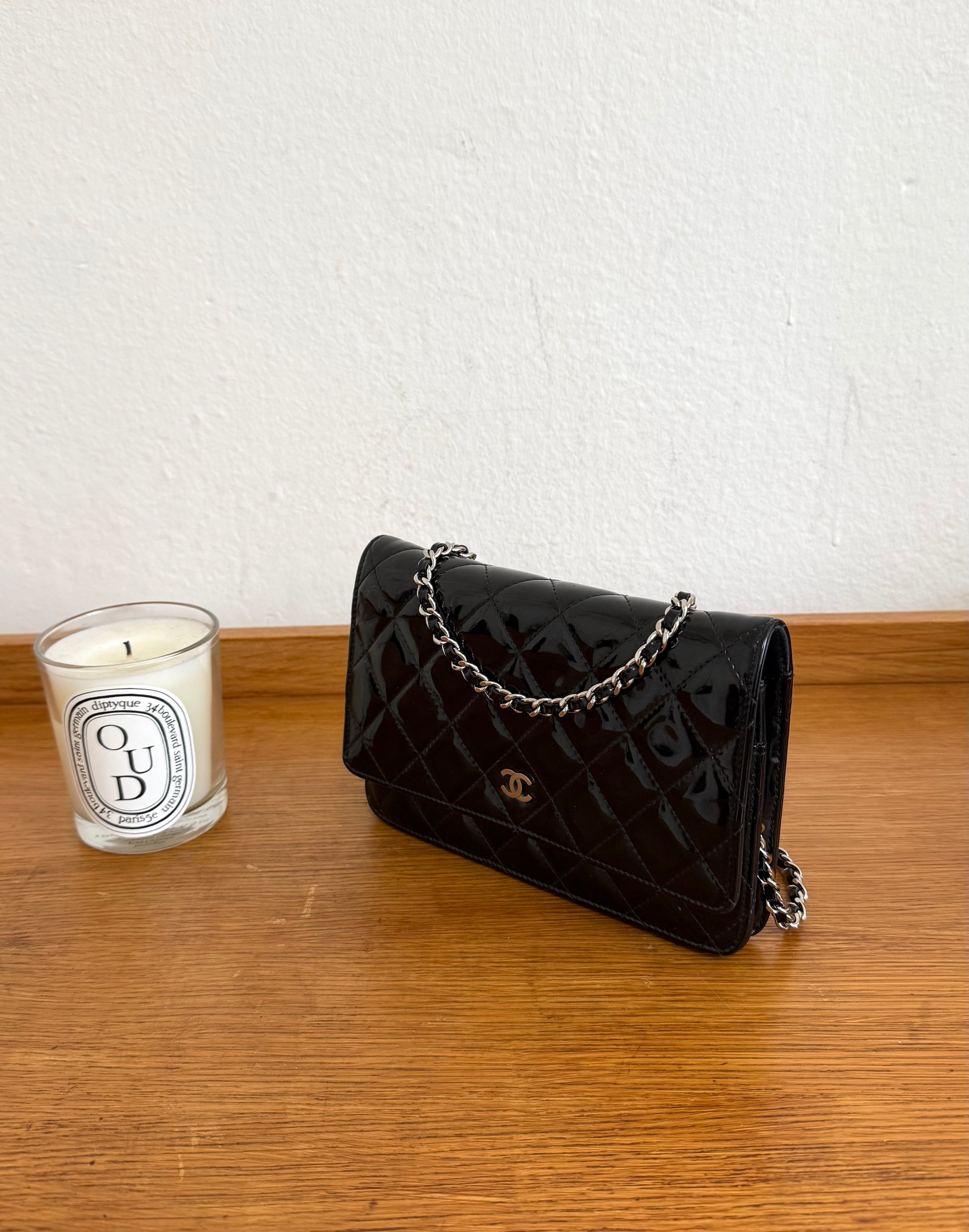Krásná Chanel Wallet On Chain z černé lakované patent leather s elegantním lesklým povrchem. Ideální volba jako kabelka na řetízku přes rameno nebo jako psaníčko do ruky.