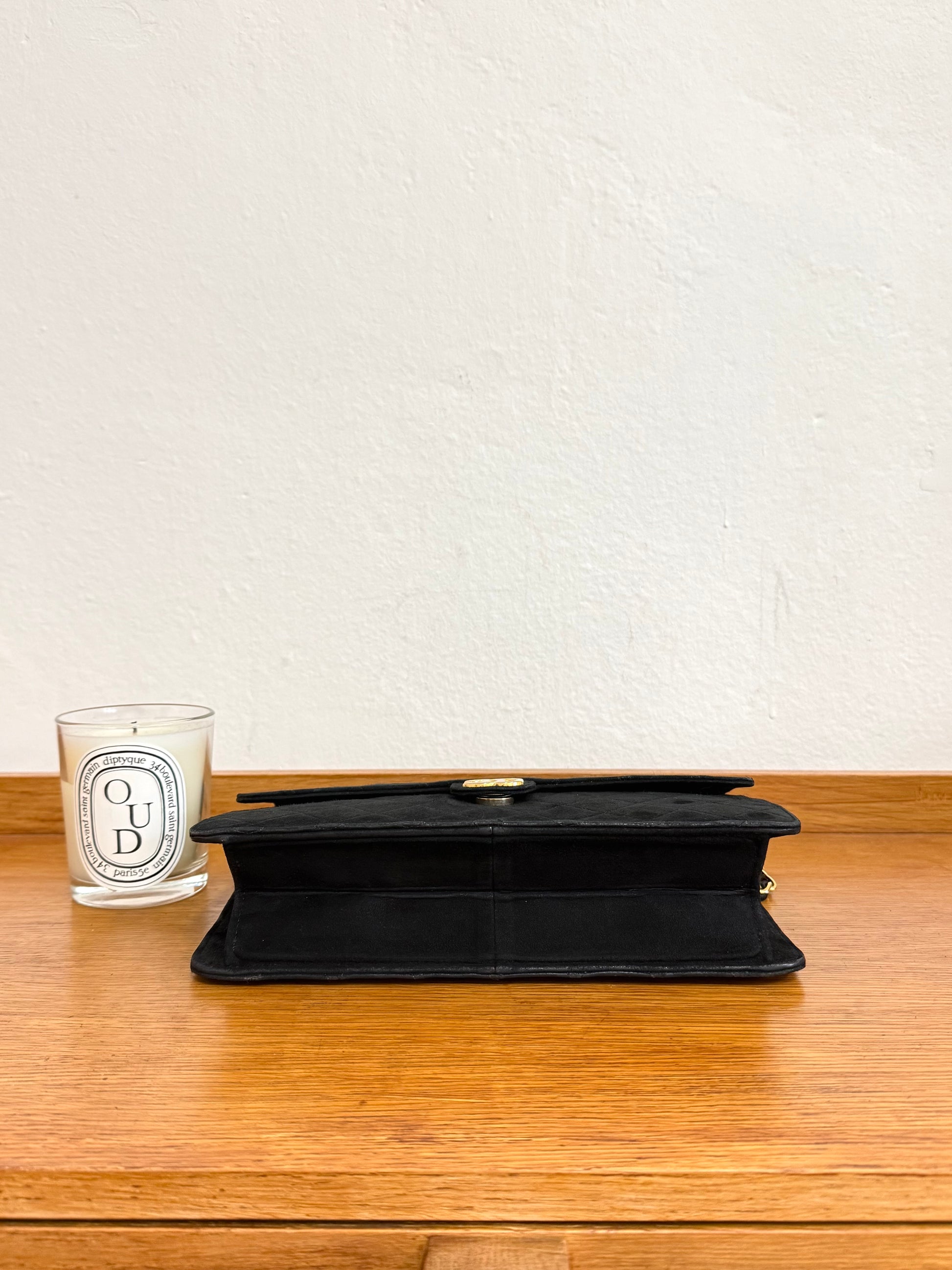 Nádherná Chanel flap bag z měkkého černého semiše se zlatým hardwarem. Nadčasová minimalistická silueta, řetízek lze zcela schovat dovnitř a z denní kabelky tak vytvořit elegantní večerní psaníčko.