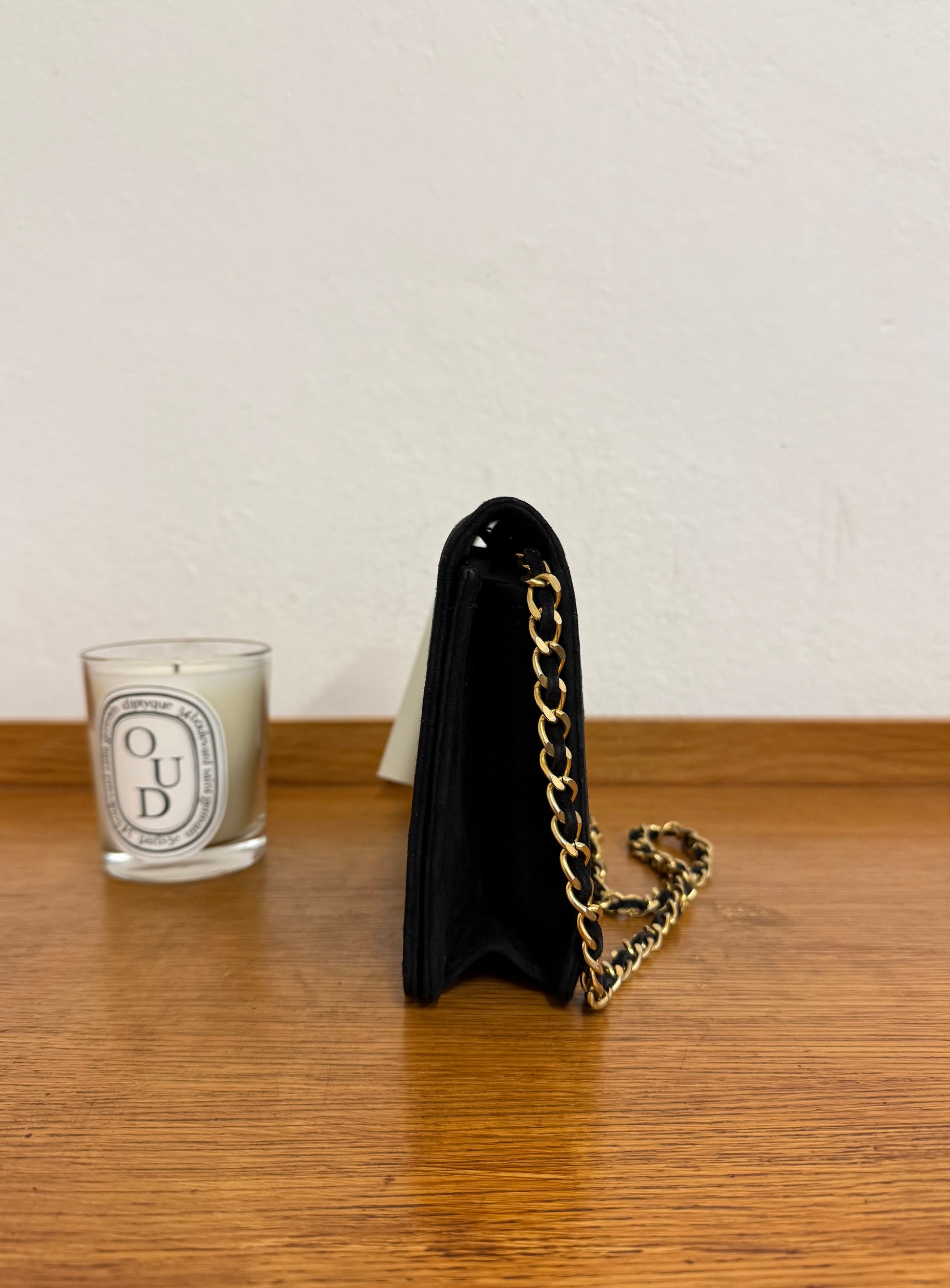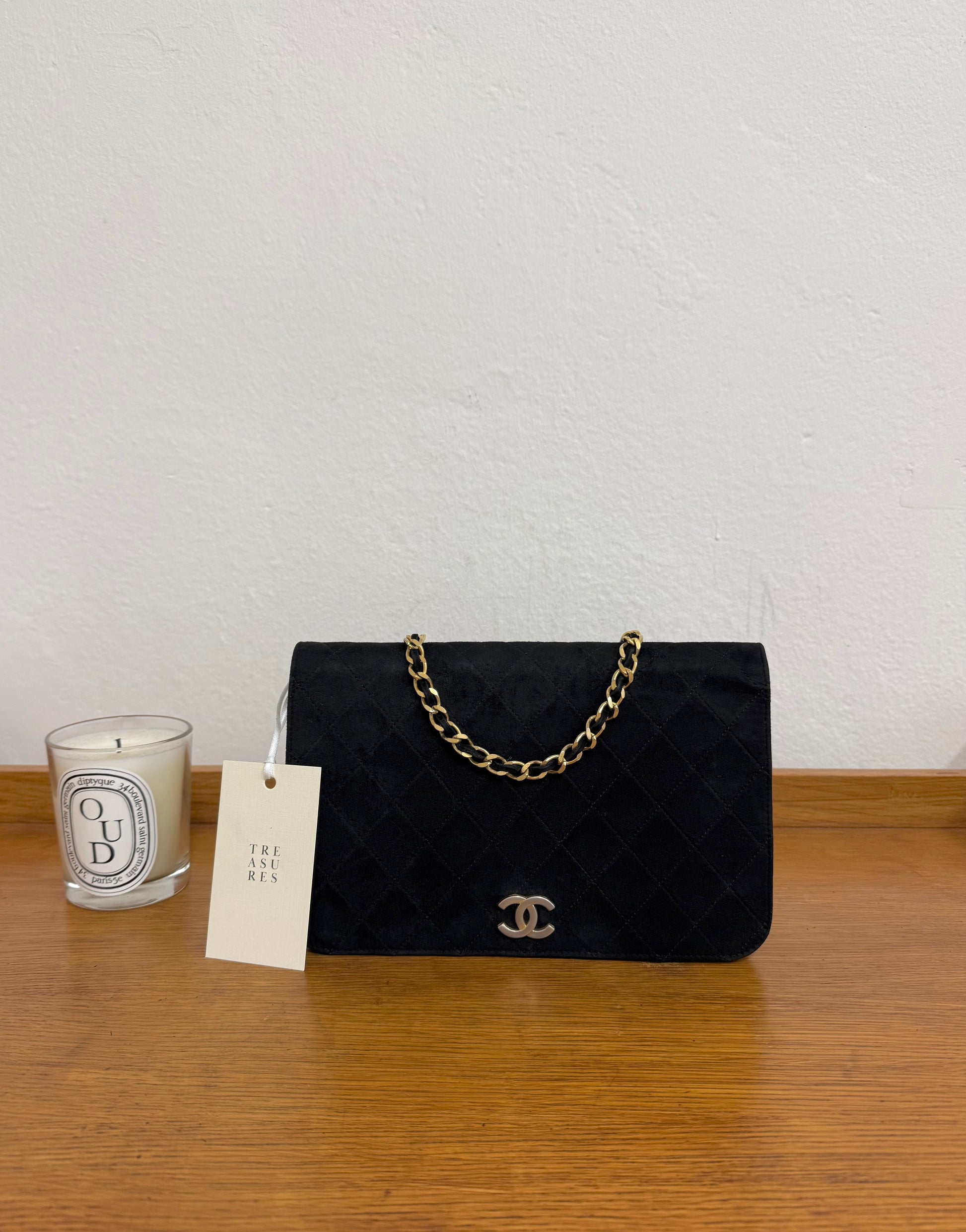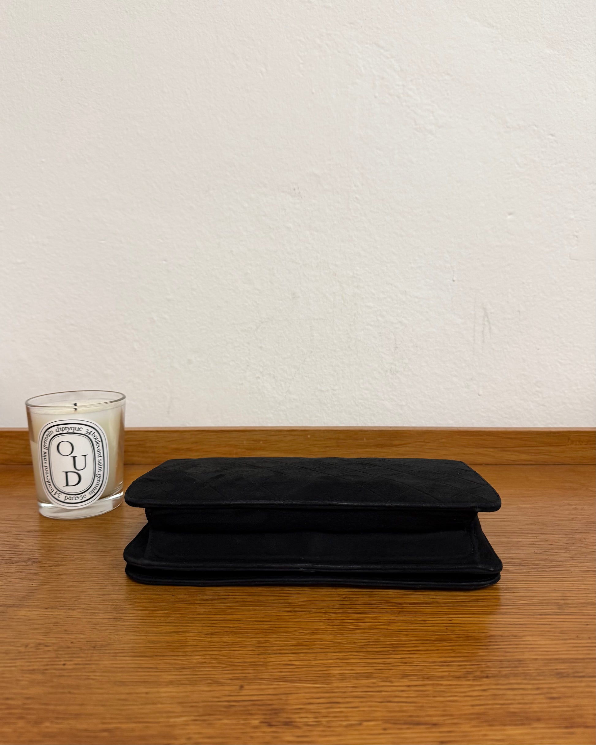 Nádherná Chanel flap bag z měkkého černého semiše se zlatým hardwarem. Nadčasová minimalistická silueta, řetízek lze zcela schovat dovnitř a z denní kabelky tak vytvořit elegantní večerní psaníčko.
