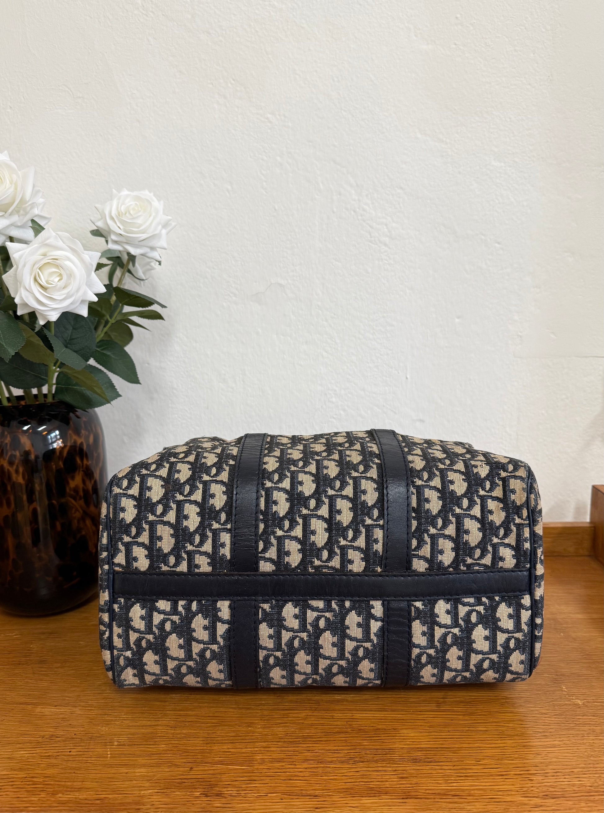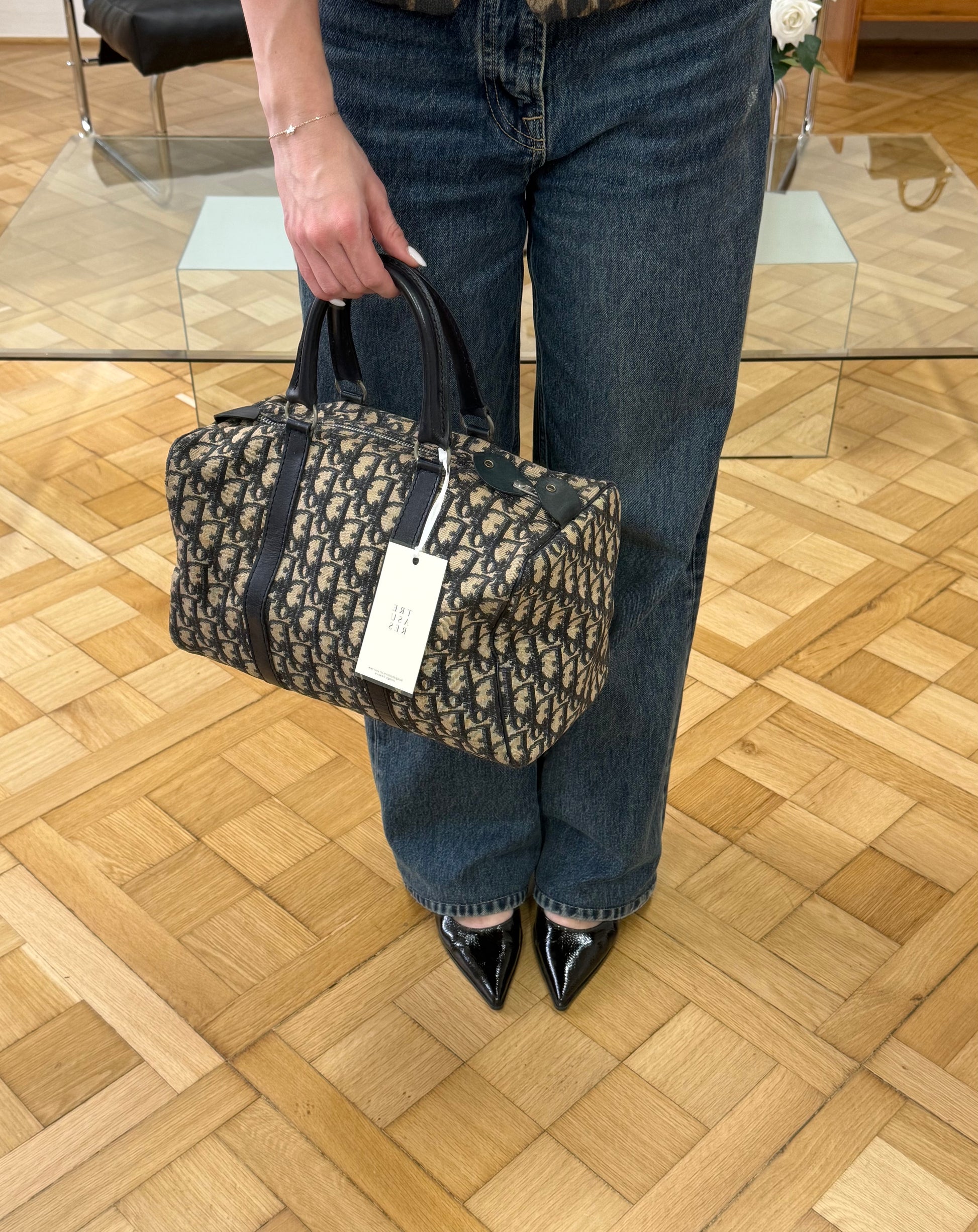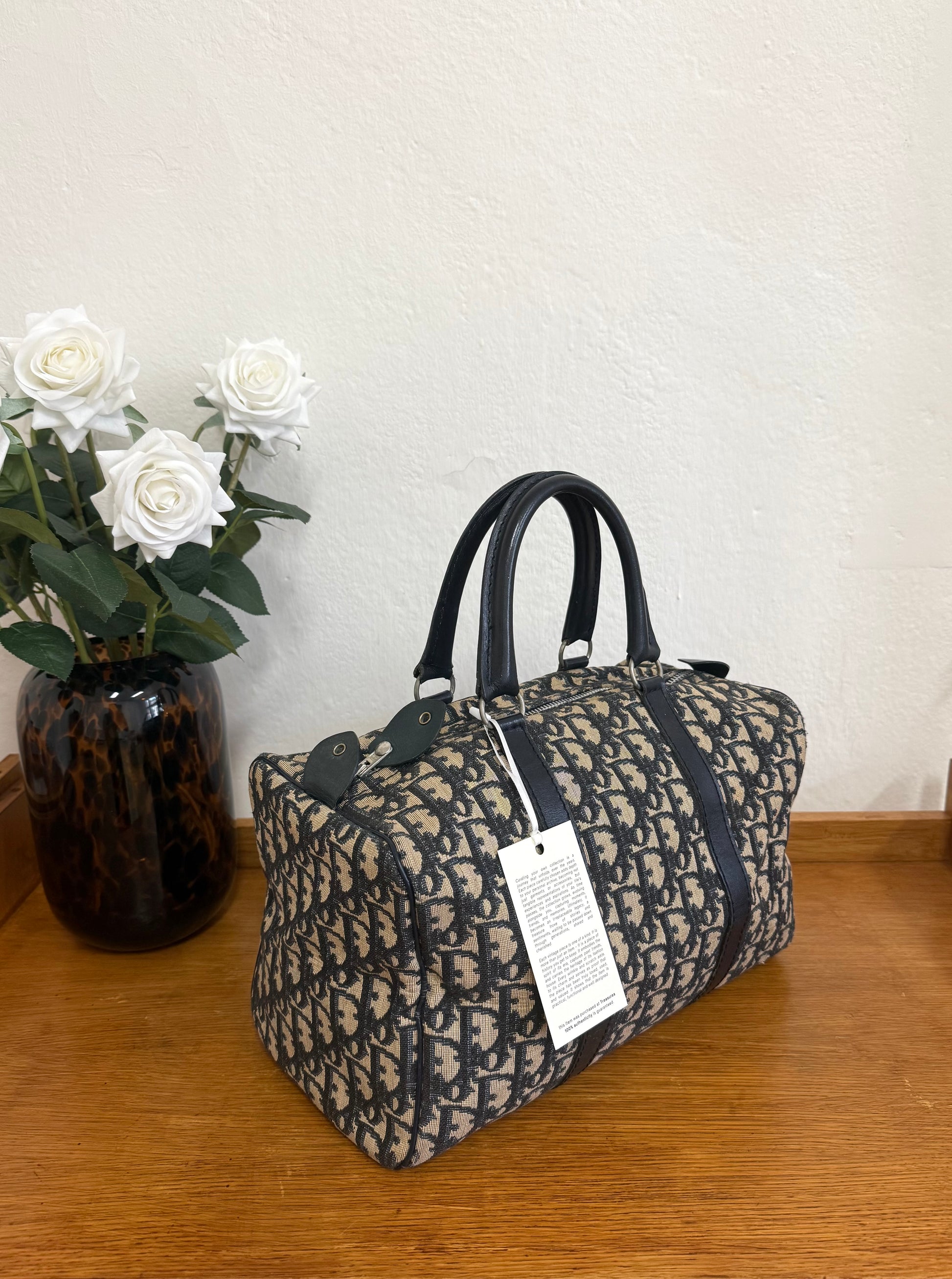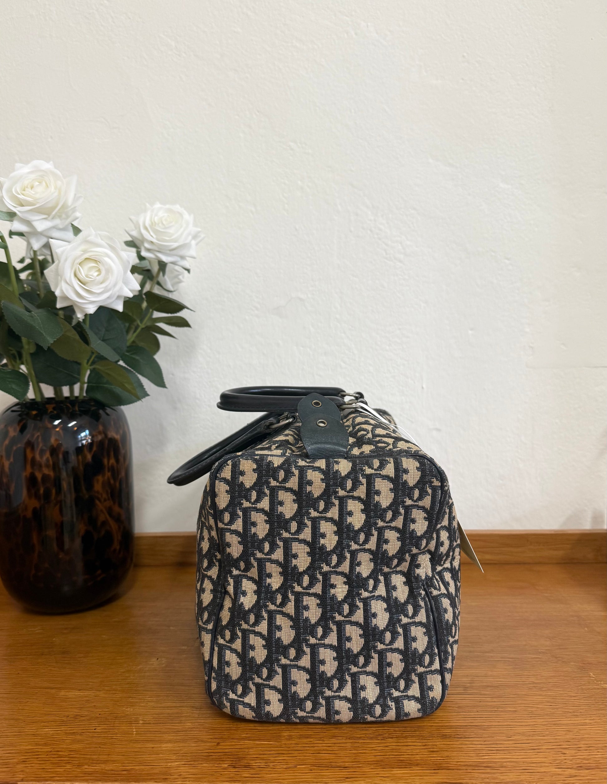 Ikonická Dior trotter boston bag v Dior Oblique monogram canvasu s tmavě modrými koženými detaily. Nadčasová a praktická kabelka, která skvěle funguje jako každodenní společník.