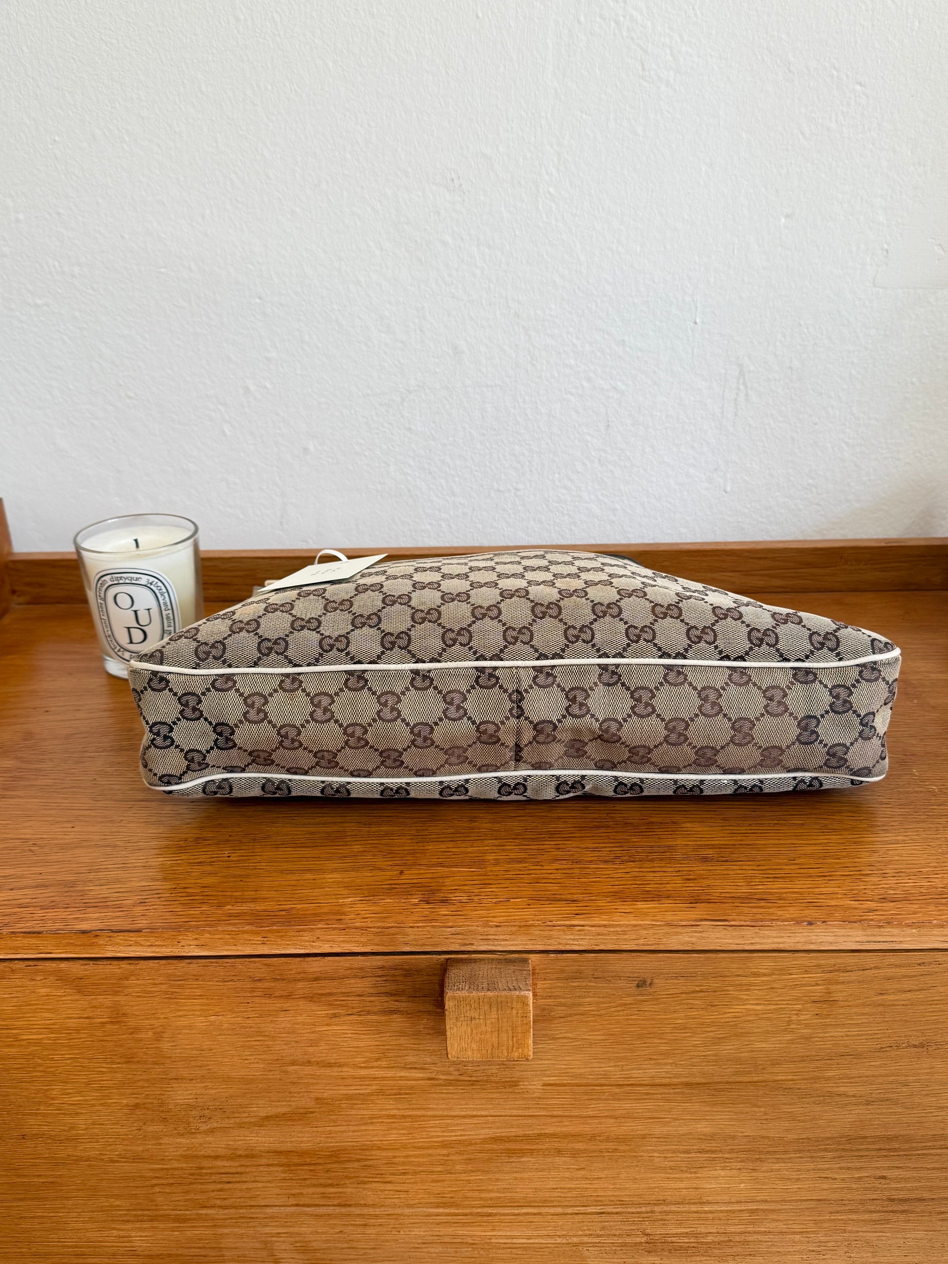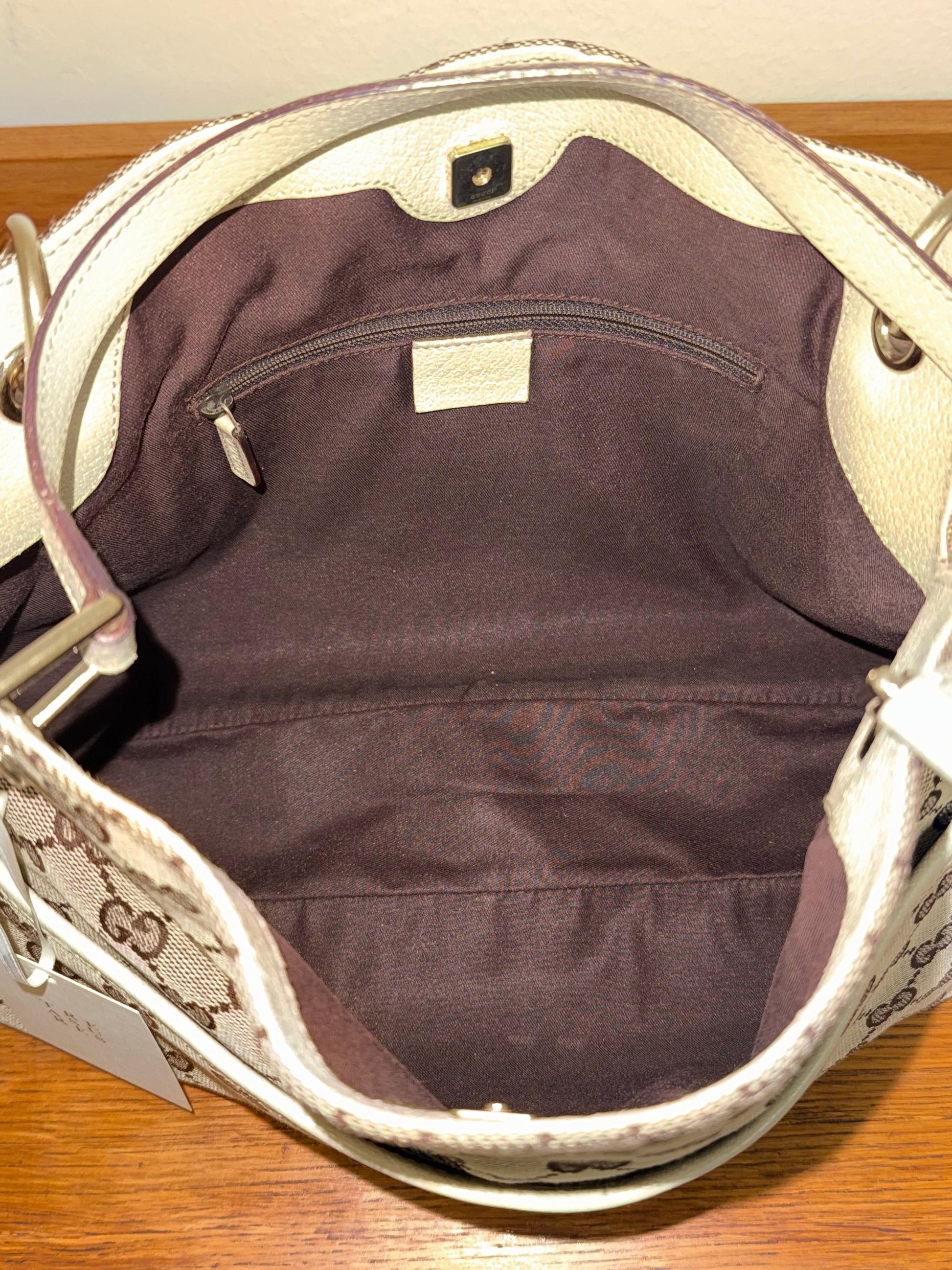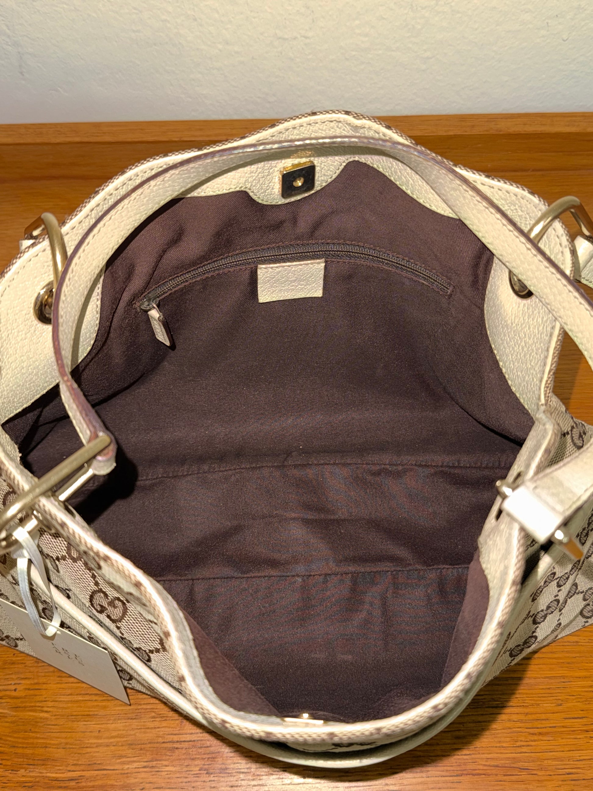 Stylová Gucci shoulder bag v klasickém GG monogram canvasu s koženými prvky. Nadčasová silueta, která se hodí ke každodennímu nošení i k elegantnějším outfitům. Praktická velikost pojme pohodlně i všechny denní nezbytnosti.