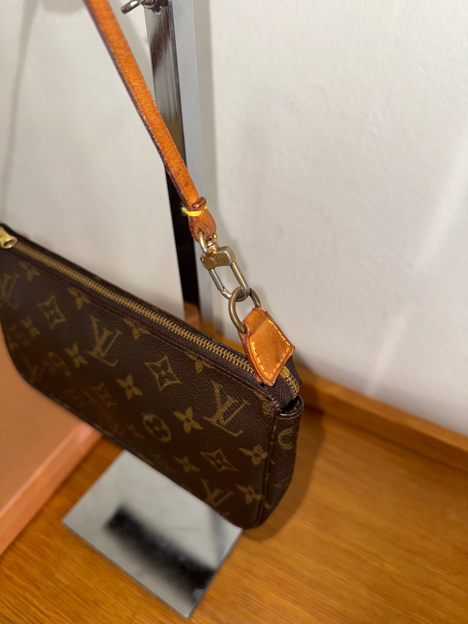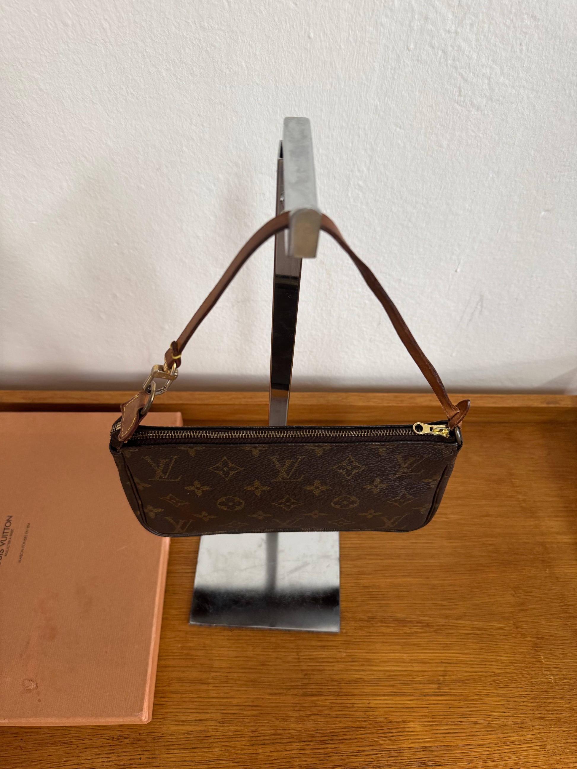 Krásná vintage Louis Vuitton pochette v klasickém monogram canvasu. Nadčasová minimalistická silueta, která se hodí jak na běžné dny. Praktická menší velikost, ideální na nezbytnosti jako telefon, klíče a rtěnku.