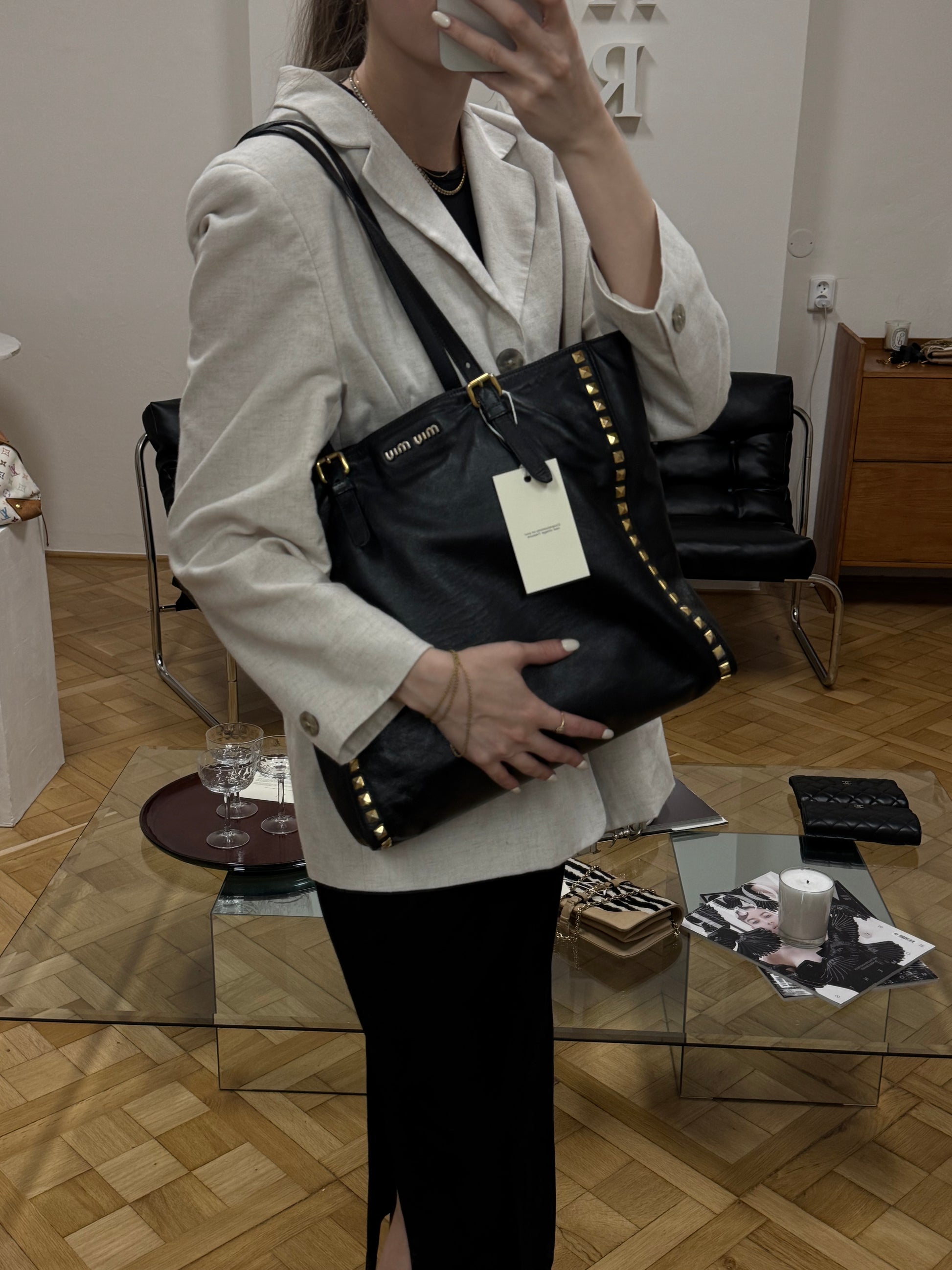 Miu Miu tote bag z černé kůže se zlatým hardwarem a cvočky. Stylová a praktická – ideální do práce, na notebook nebo jako chic společník pro každý den.