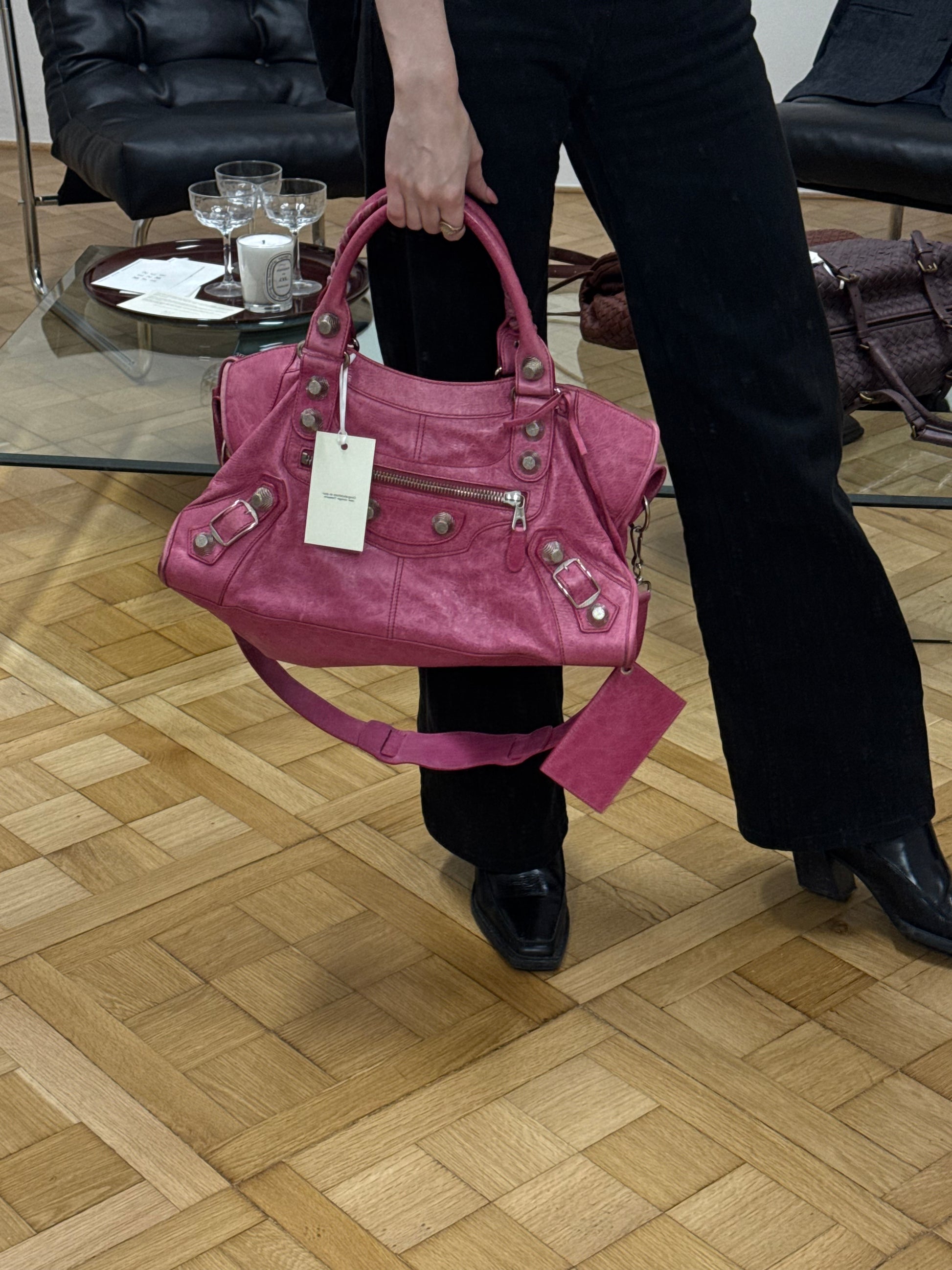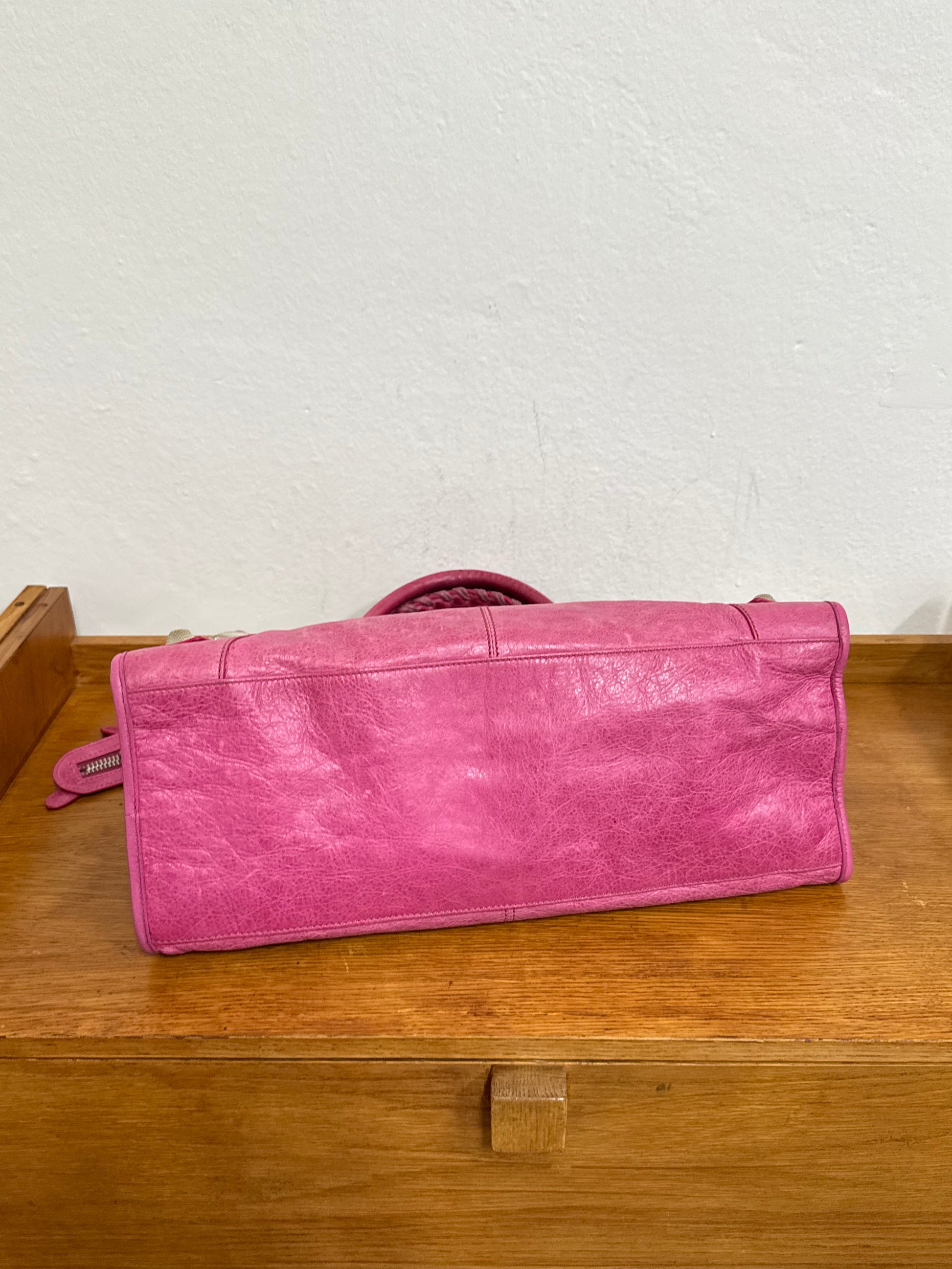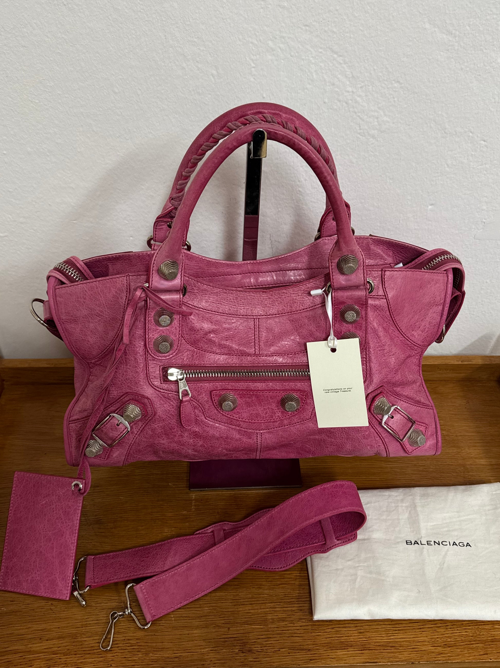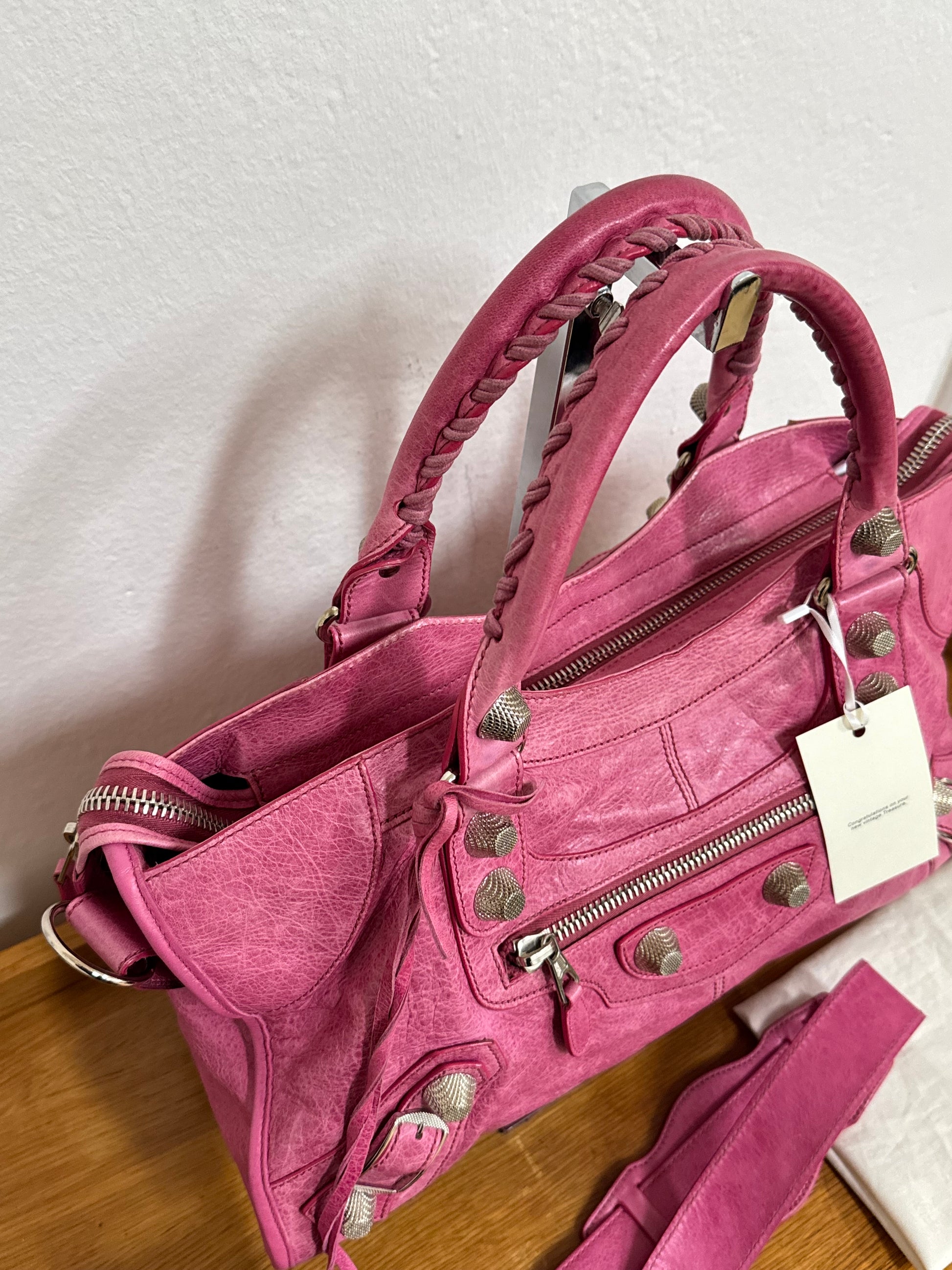 Nádherná Balenciaga City bag z růžové kůže se stříbrným hardwarem. Ikonický model s charakteristickými zipy, třásněmi a lehkou měkkou kúží, která z něj dělá ideální kabelku pro každý den.