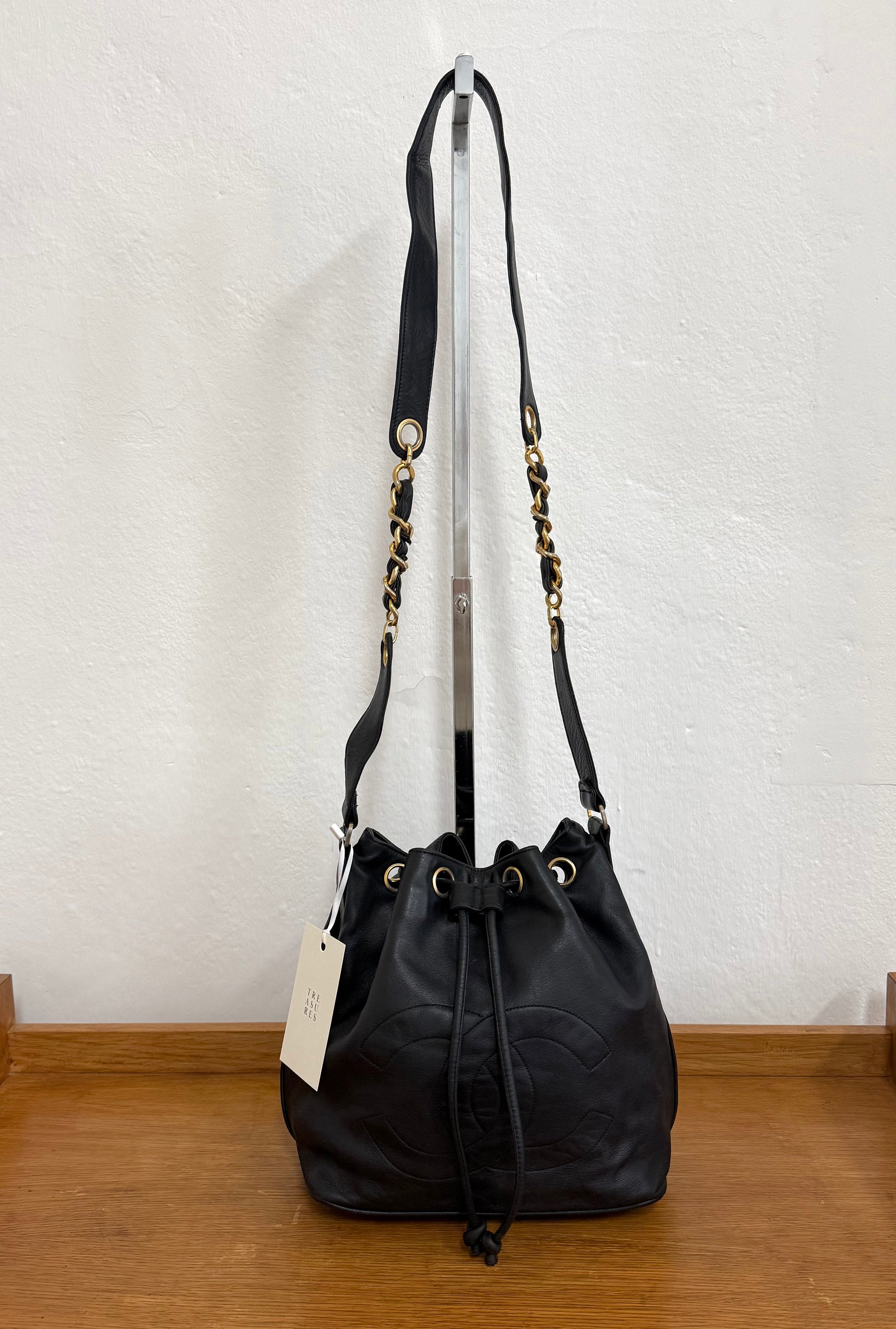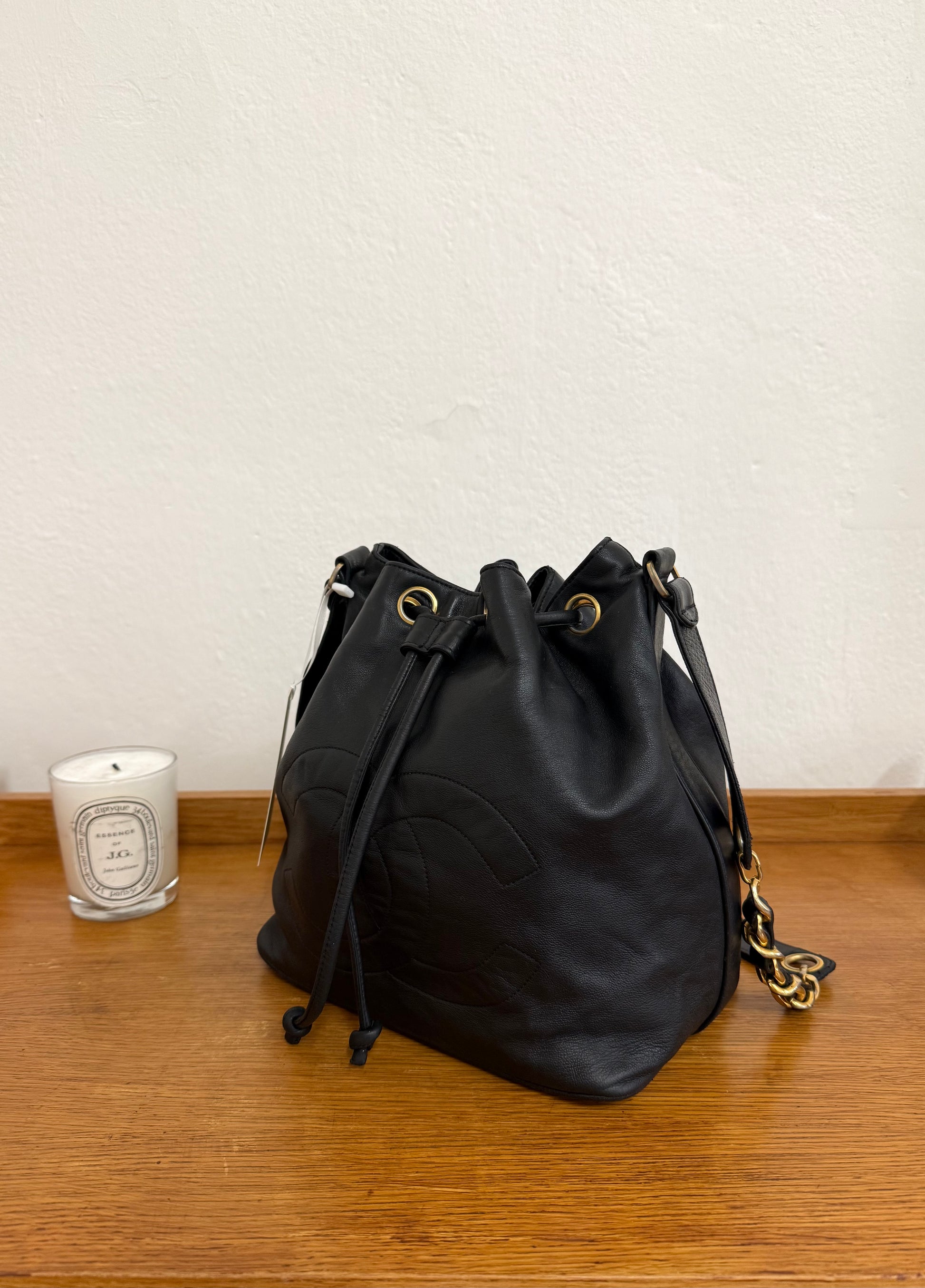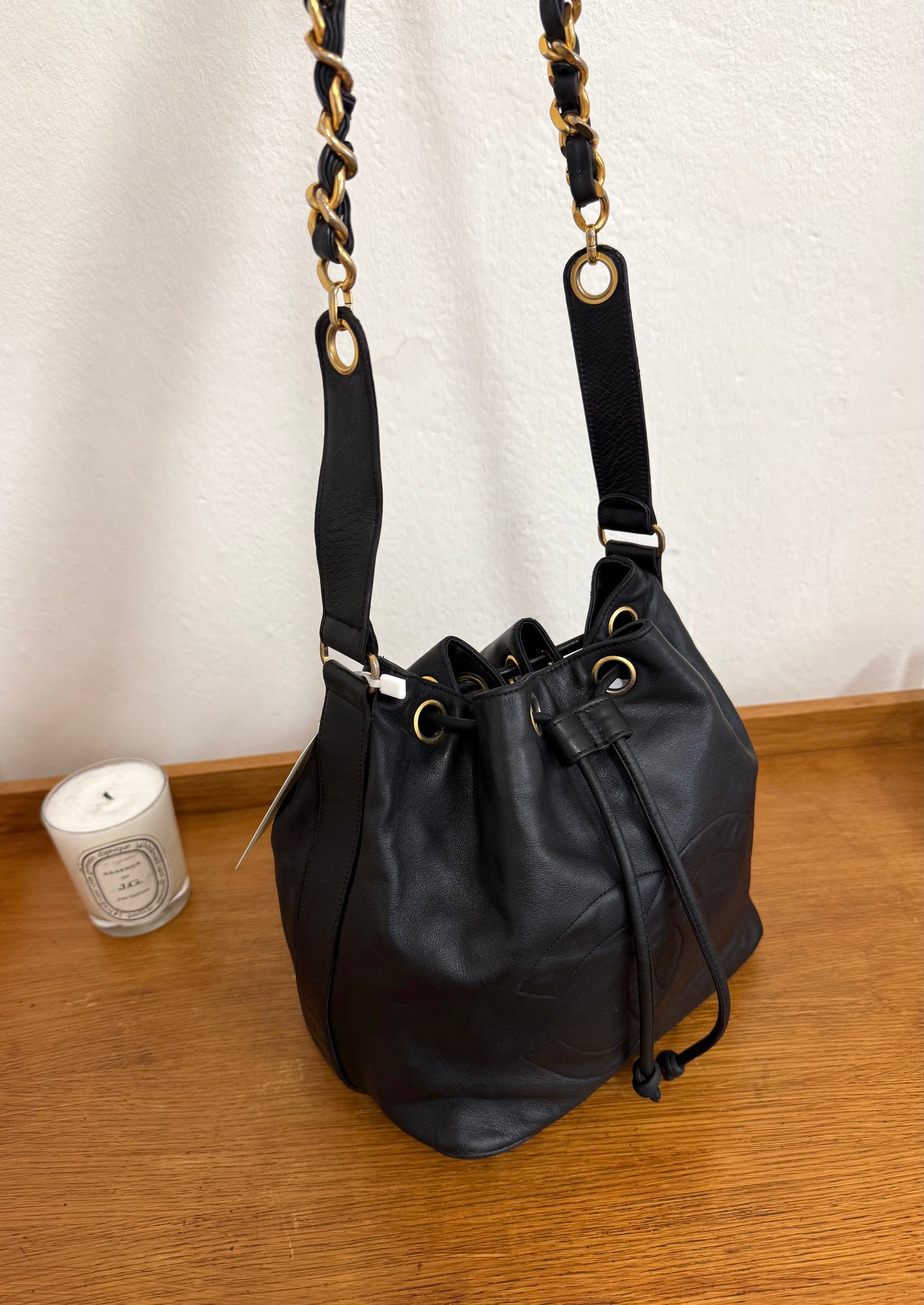 Nádherný Chanel Bucket Bag s velkým CC logem v černé barvě se zlatým hardwarem. Praktická a nadčasová silueta, jejíž součástí je i originální malá pouch taštička.