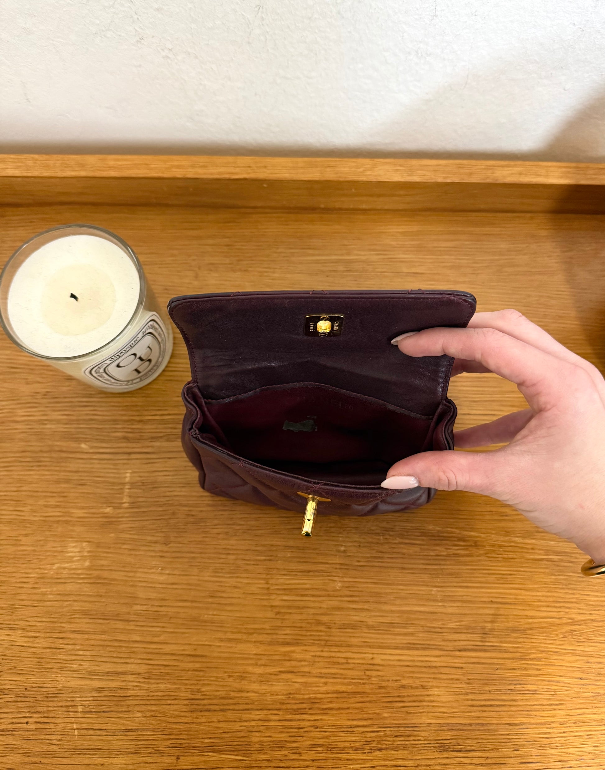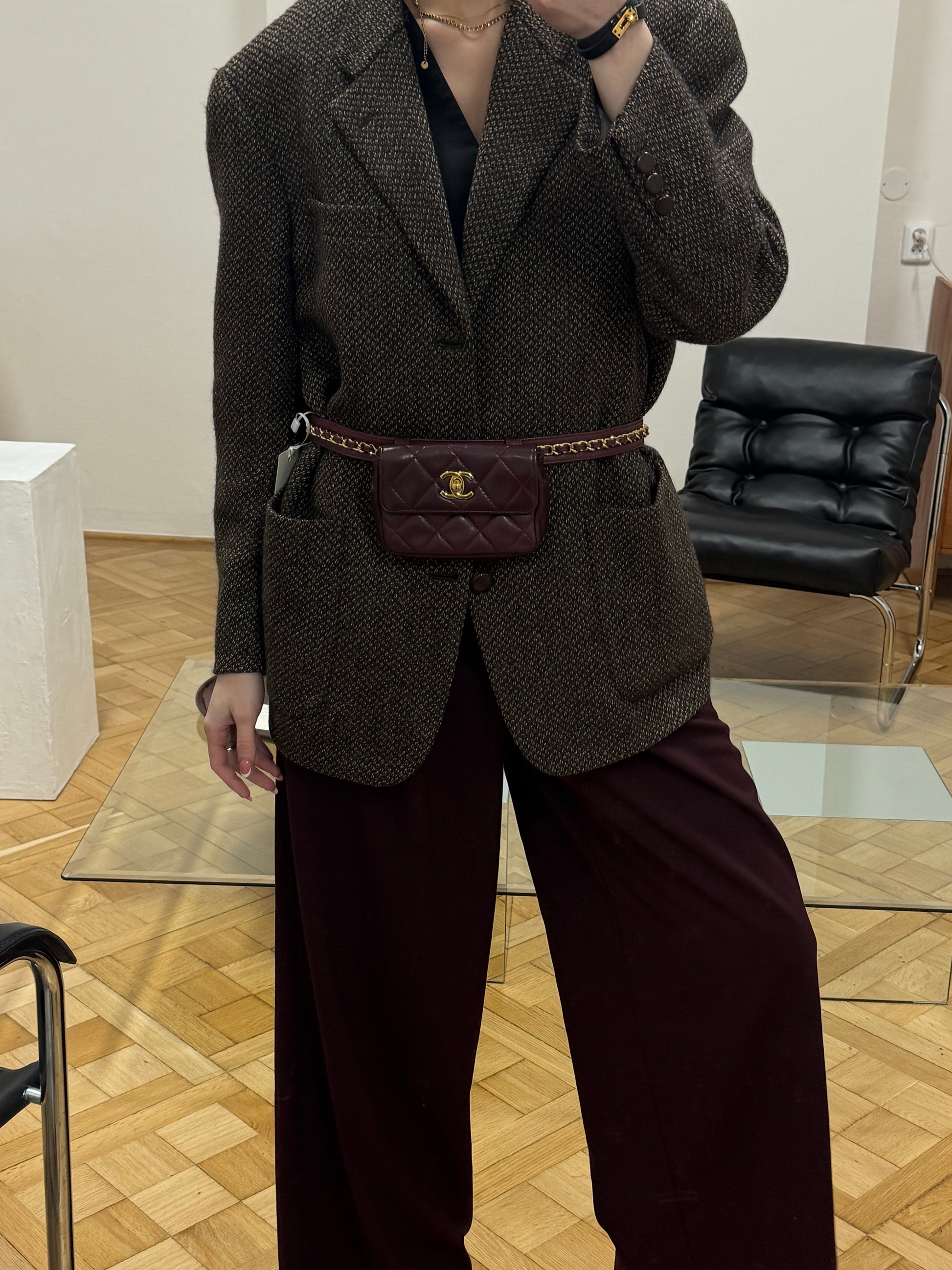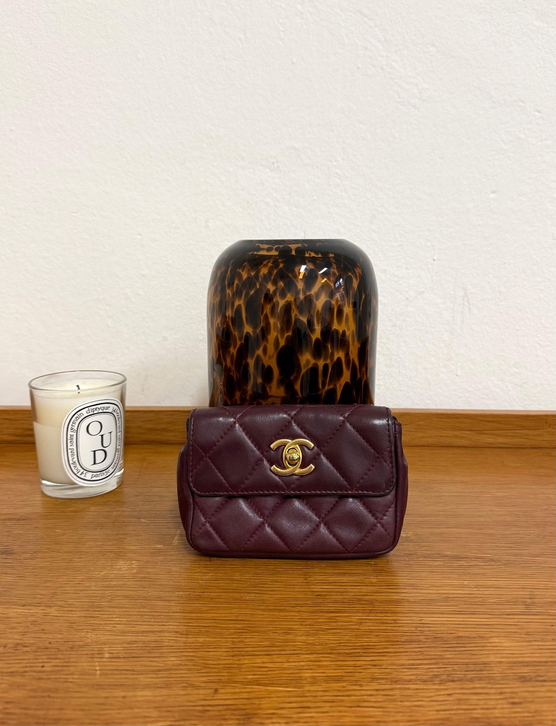 Nádherná mini Chanel belt bag z jemné jehněčí kůže v burgundy odstínu. Stylový malý doplněk, ideální, když chceš mít jen to nejnutnější elegantně po ruce.