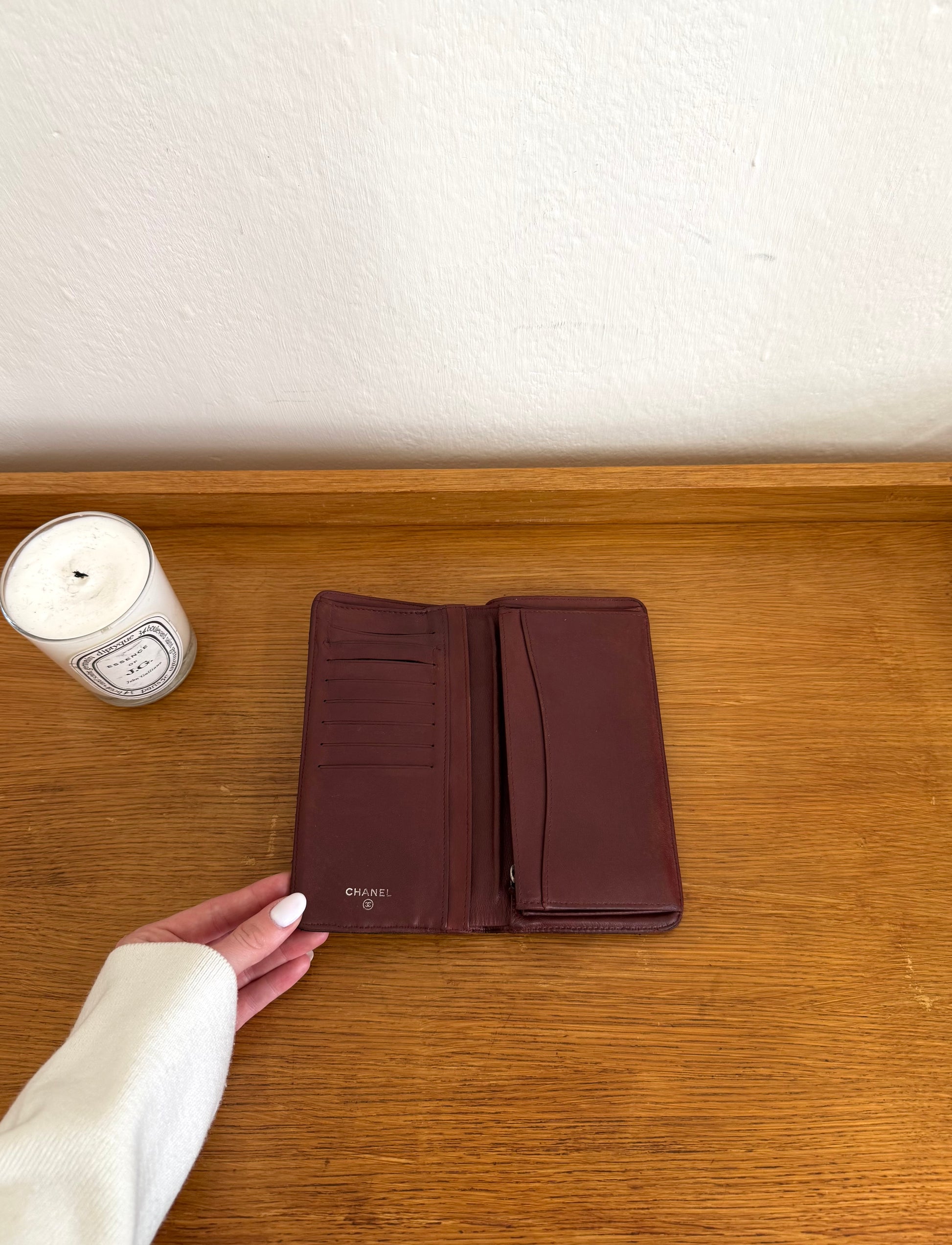 Chanel long wallet z jemné jehněčí kůže, v černé barvě se stříbrným hardwarem a ikonickým burgundy interiérem. Lze ji nosit jako psaníčko do ruky, na řetízku přes rameno, nebo jako klasickou peněženku do kabelky.