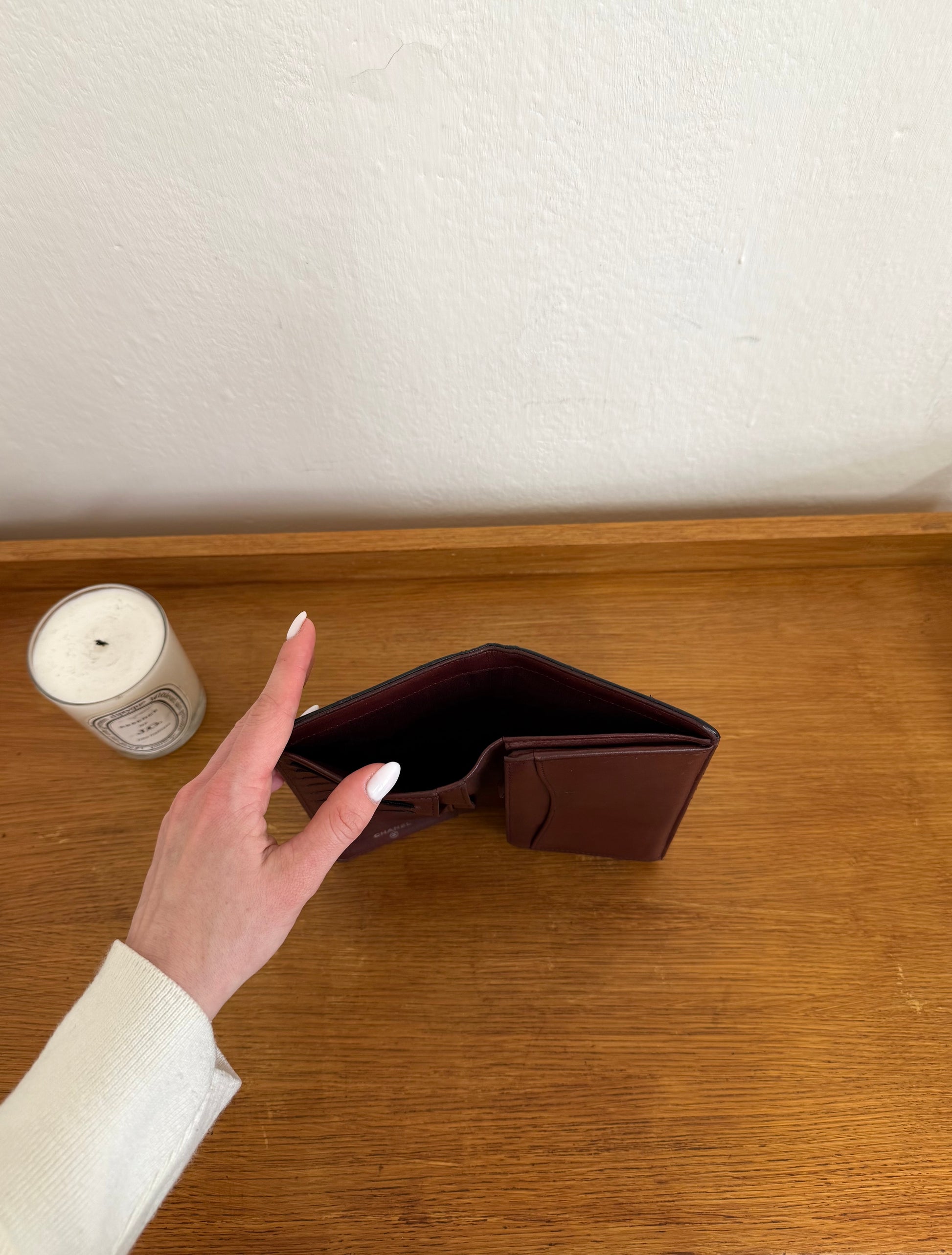 Chanel long wallet z jemné jehněčí kůže, v černé barvě se stříbrným hardwarem a ikonickým burgundy interiérem. Lze ji nosit jako psaníčko do ruky, na řetízku přes rameno, nebo jako klasickou peněženku do kabelky.