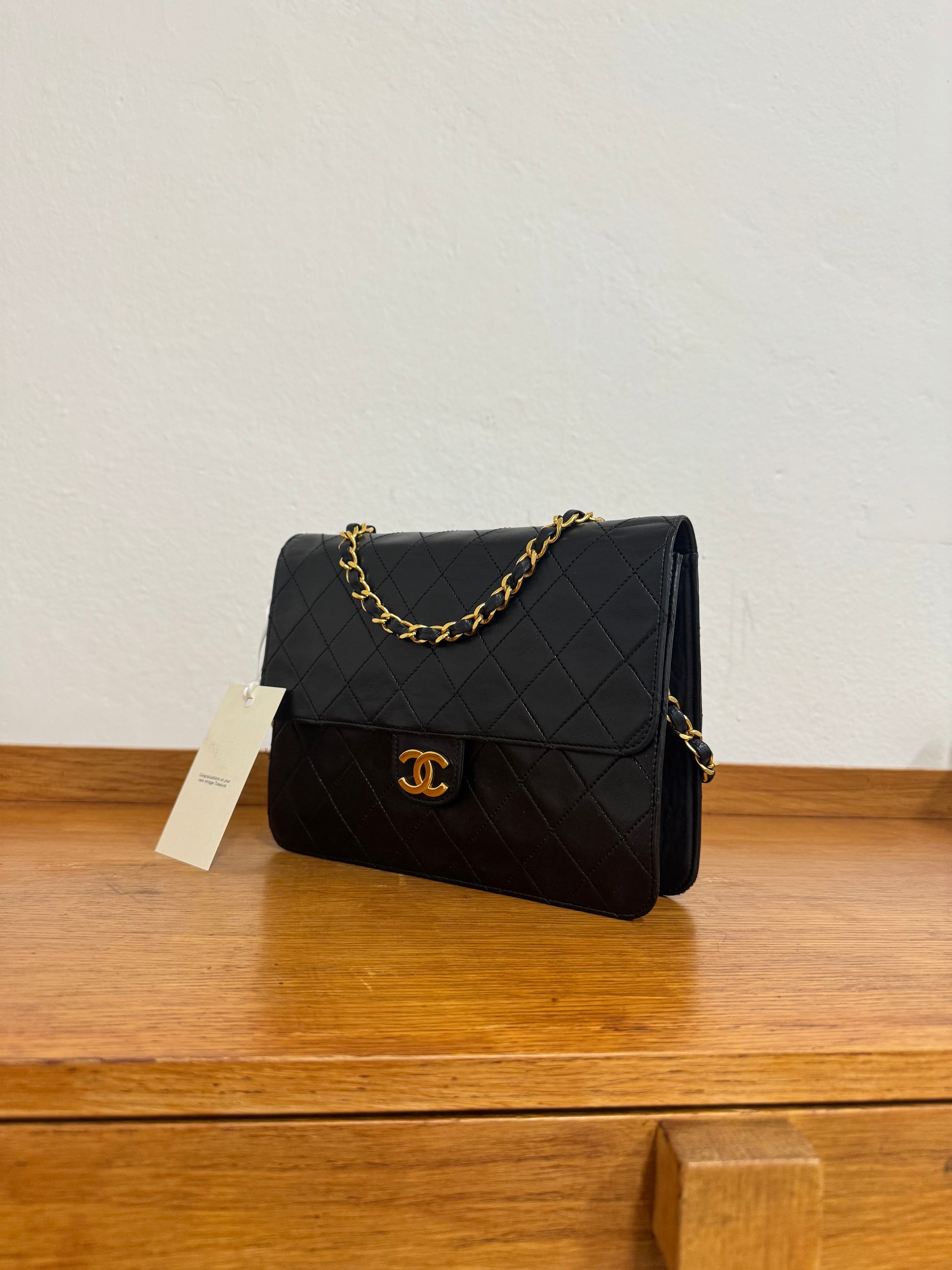 Chanel single flap bag z jemné jehněčí kůže v černé barvě se 24k pozlaceným hardwarem z 80. let. Klasická oblíbená flap silueta s řetízkem a clasp zapínáním. Výjimečně zachovalý kousek v překrásném stavu se všemi původními komponenty potěší i ty nejnáročnější klienty.