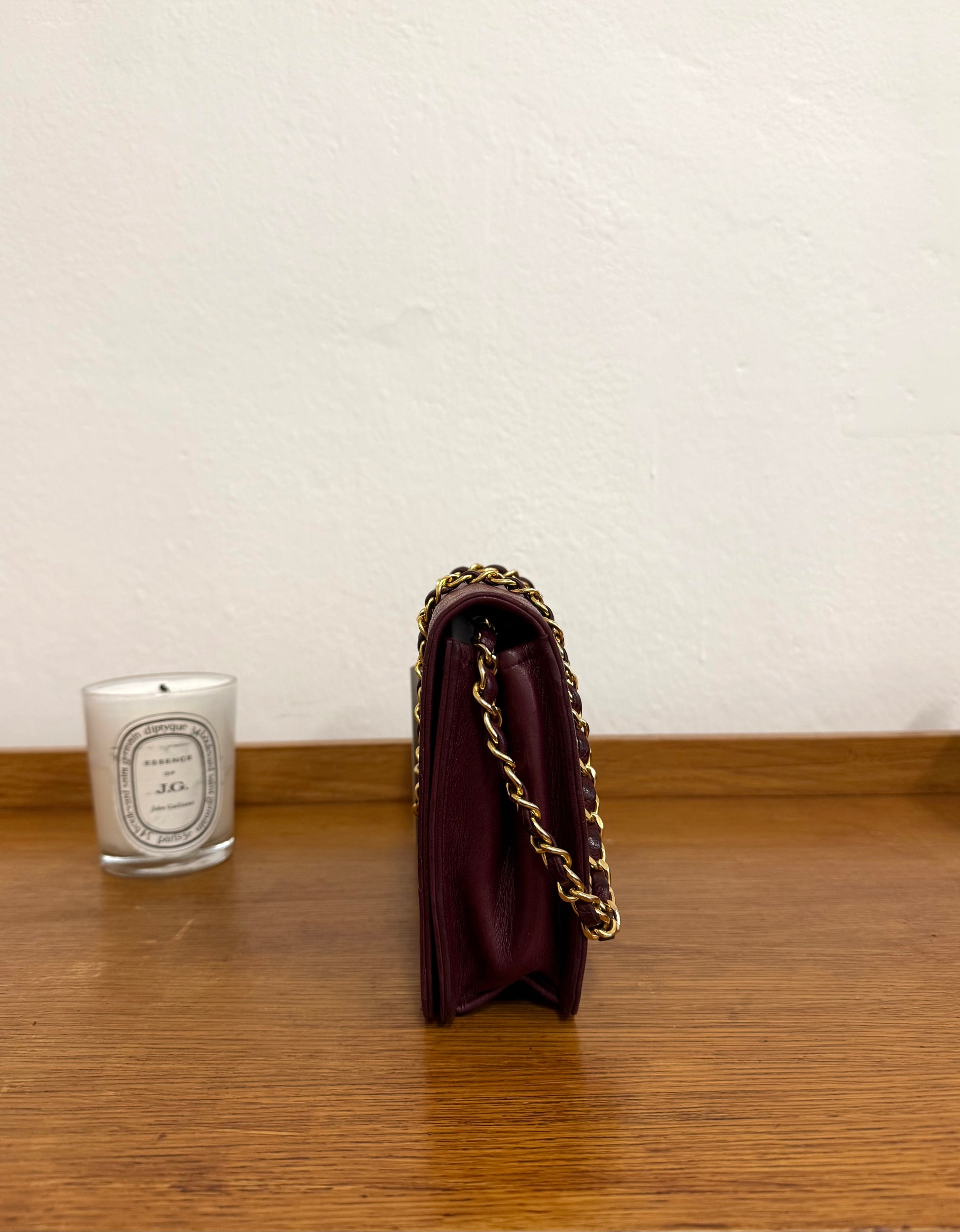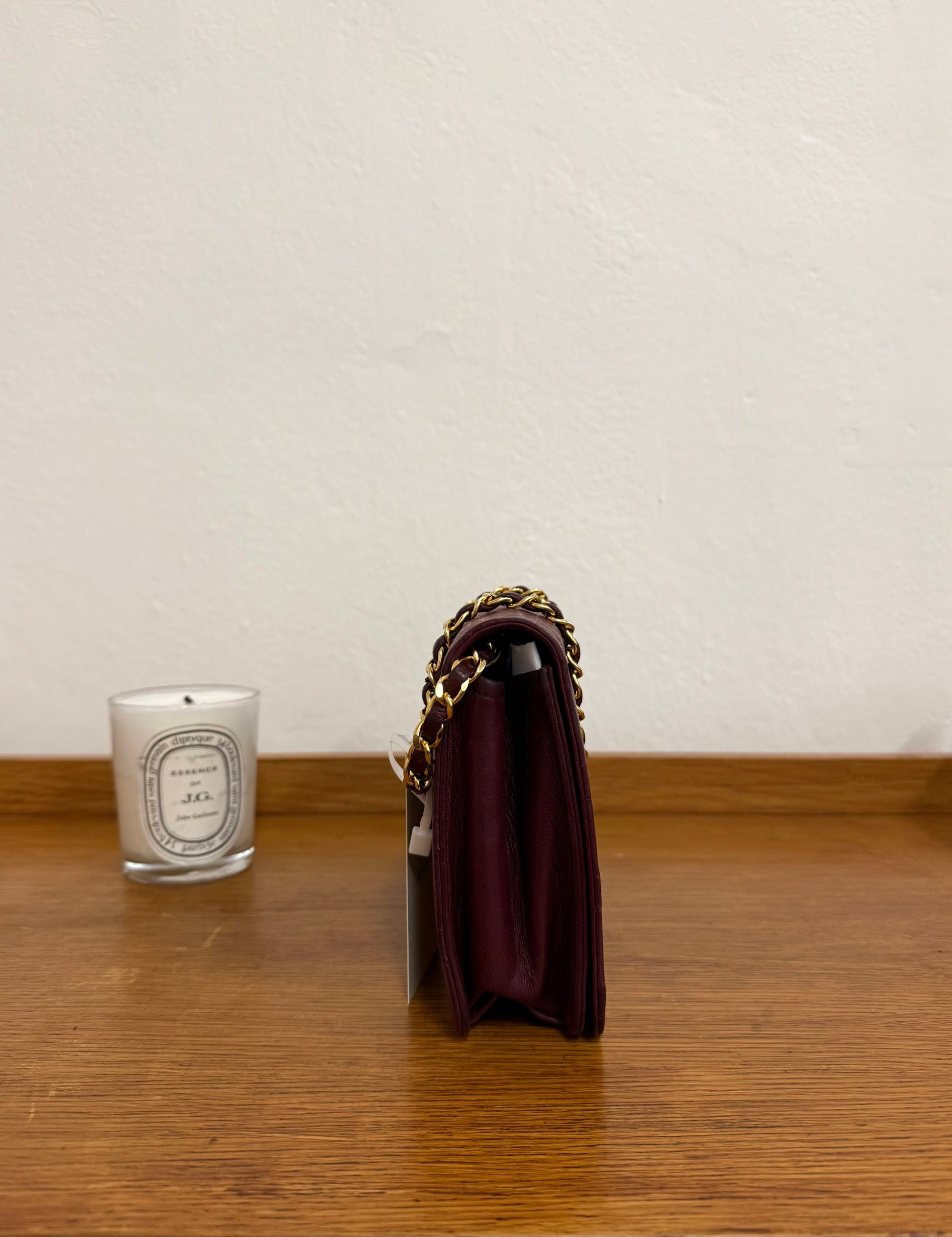 Elegantní Chanel full flap z jemné jehněčí kůže v krásném burgundy odstínu. Hebká lambskin kůže je mimořádně jemná na dotek, hardware je stále krásně zlatý. Univerzální silueta, kterou lze snadno proměnit z denní kabelky na večerní psaníčko – stačí jen schovat řetízek dovnitř.