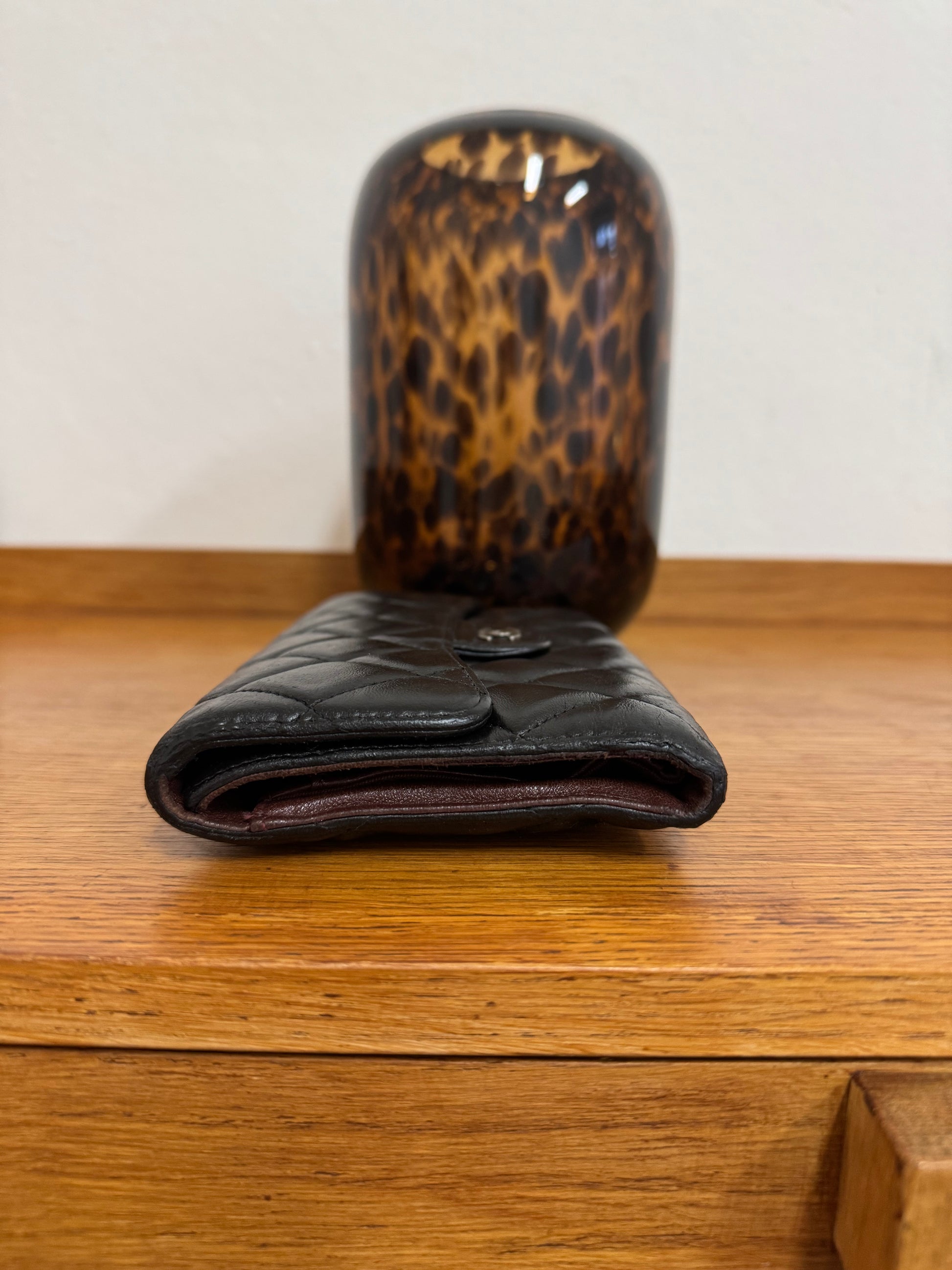 Elegantní Chanel peněženka z jehněčí kůže v černé barvě se stříbrným hardwarem a ikonickým burgundy interiérem. Nadčasový kousek, který poslouží jako psaníčko do ruky, doplněk na řetízek, nebo jako klasická peněženka do kabelky.