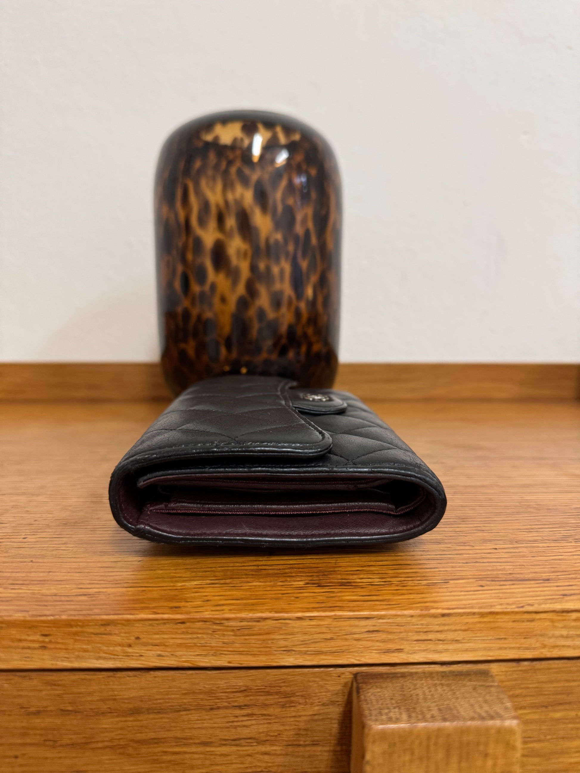 Elegantní Chanel peněženka z jehněčí kůže v černé barvě se stříbrným hardwarem a ikonickým burgundy interiérem. Nadčasový kousek, který poslouží jako psaníčko do ruky, doplněk na řetízek, nebo jako klasická peněženka do kabelky.