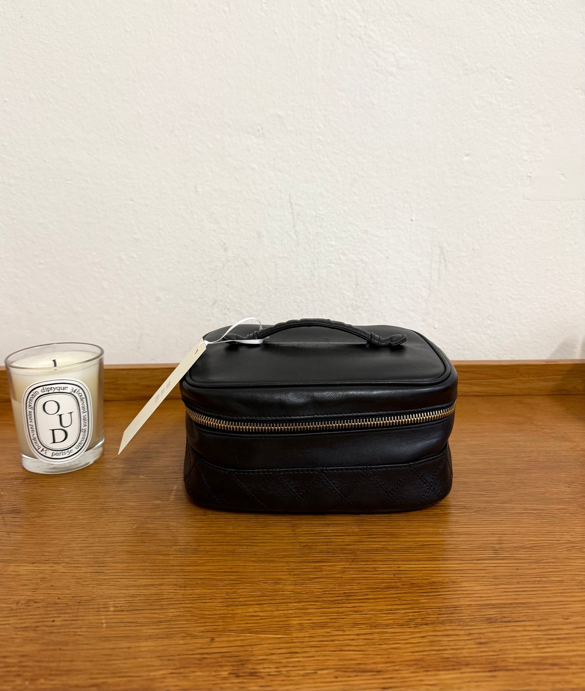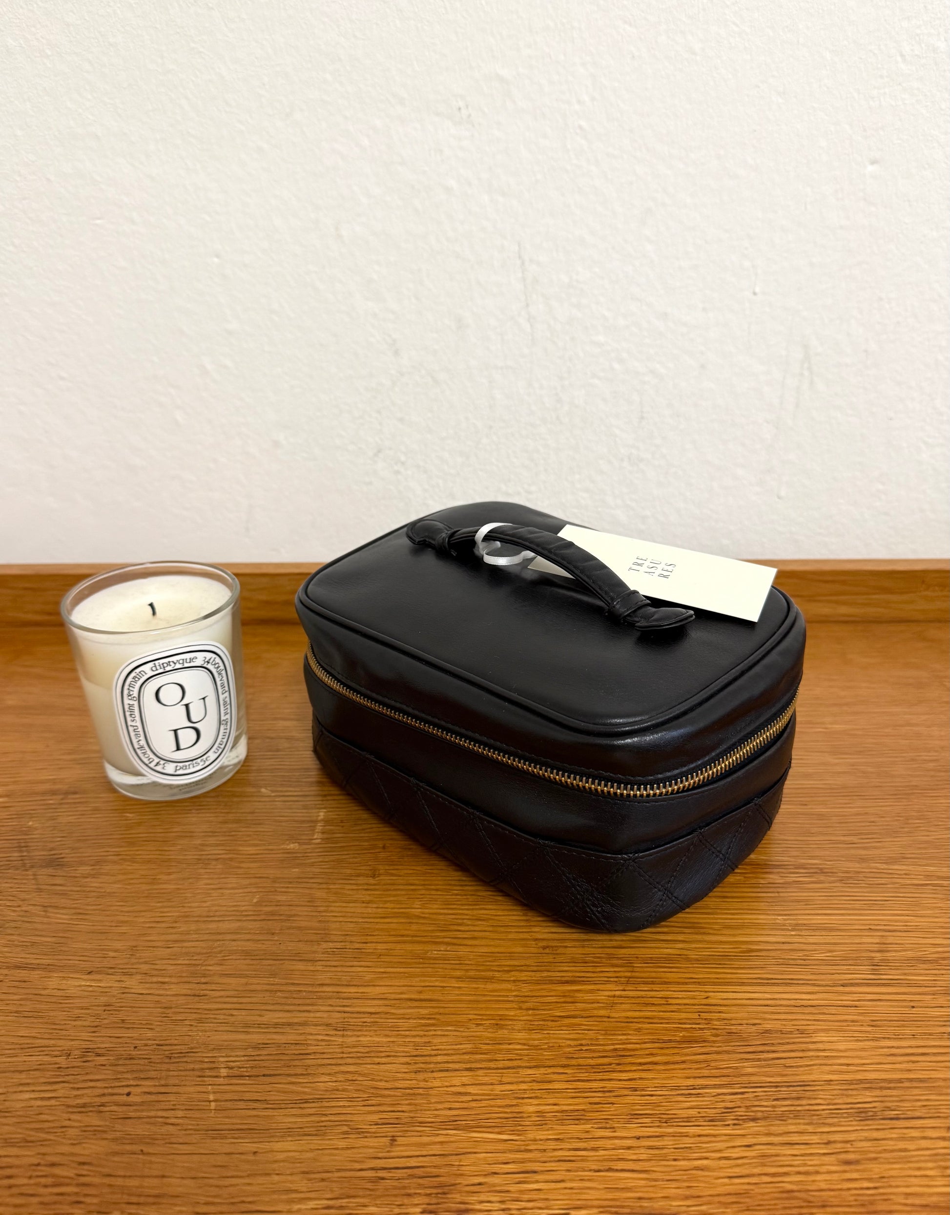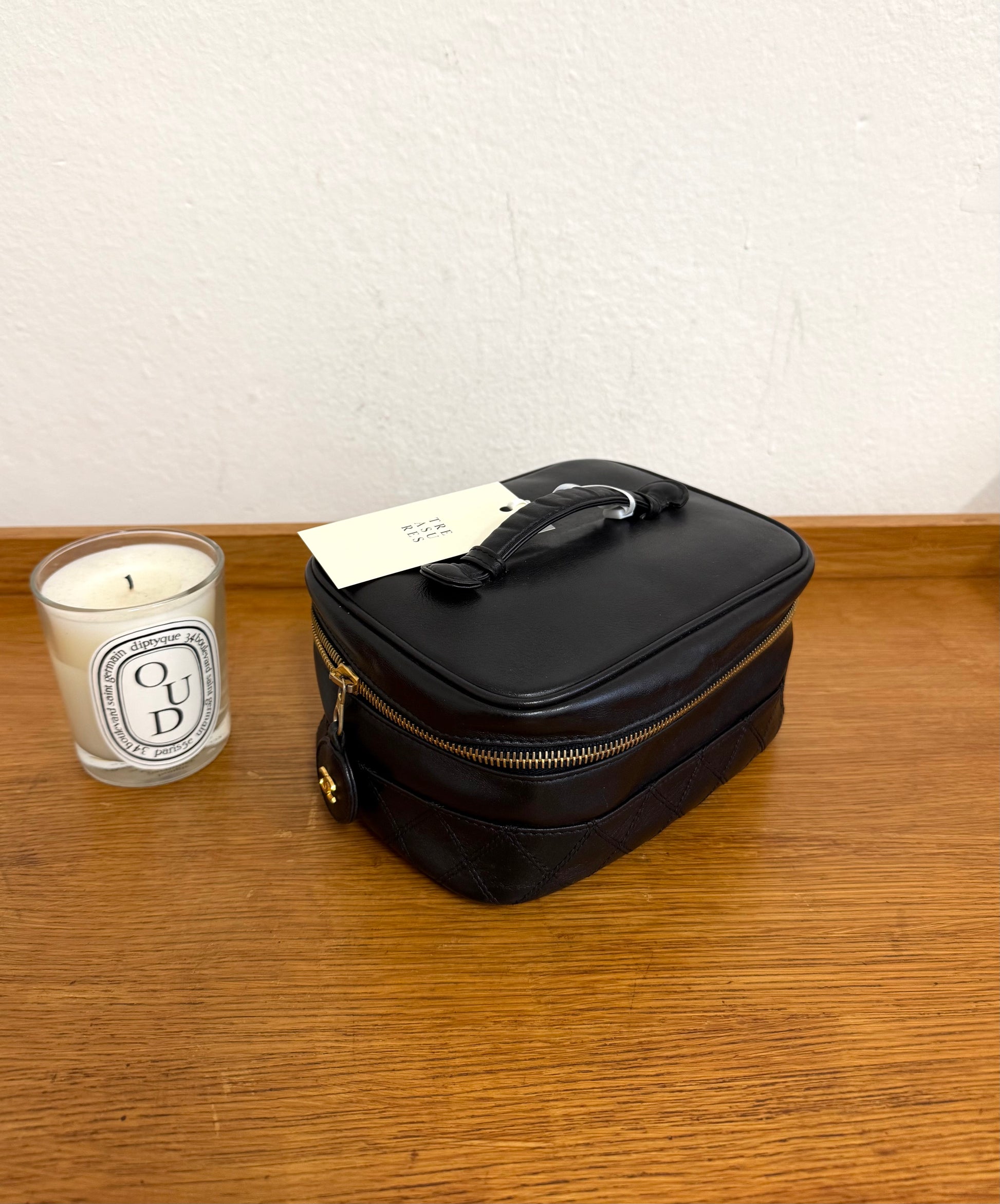 Elegantní Chanel make-up taštička z jemné černé jehněčí kůže se zlatým hardwarem. Nadčasový doplněk, který se skvěle hodí nejen na cestování, ale i jako stylový úložný kousek na kosmetiku nebo šperky.