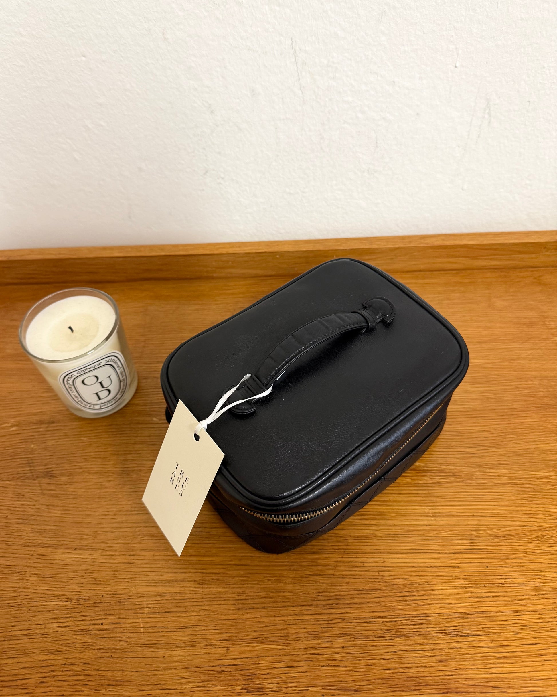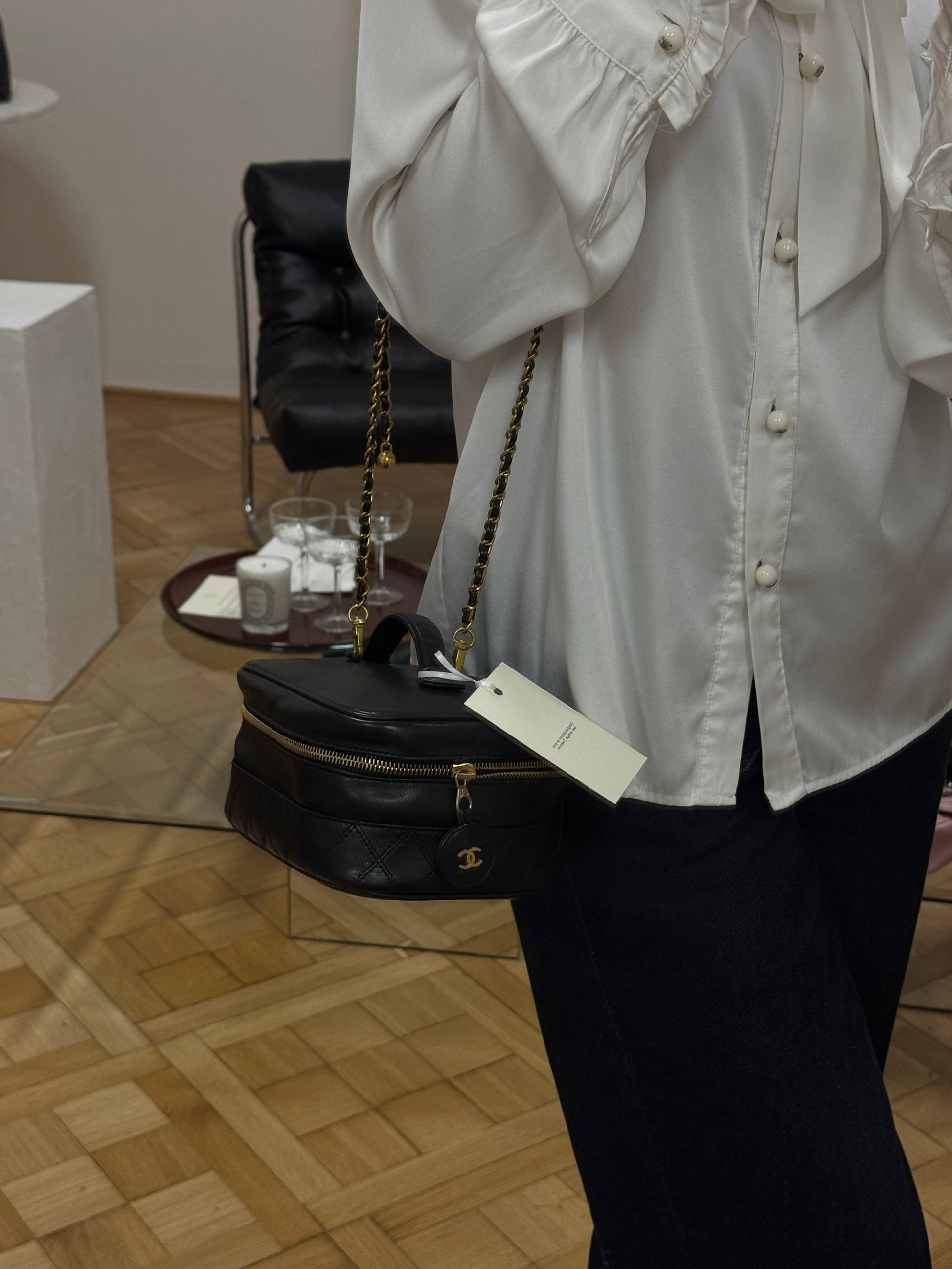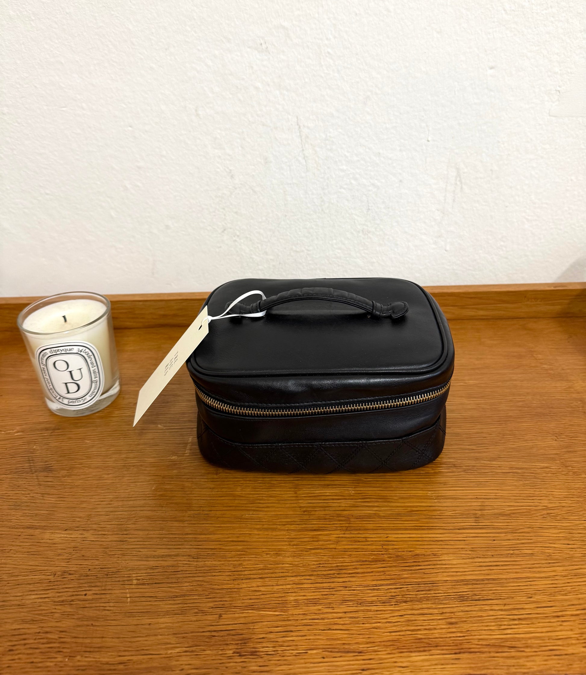 Elegantní Chanel make-up taštička z jemné černé jehněčí kůže se zlatým hardwarem. Nadčasový doplněk, který se skvěle hodí nejen na cestování, ale i jako stylový úložný kousek na kosmetiku nebo šperky.
