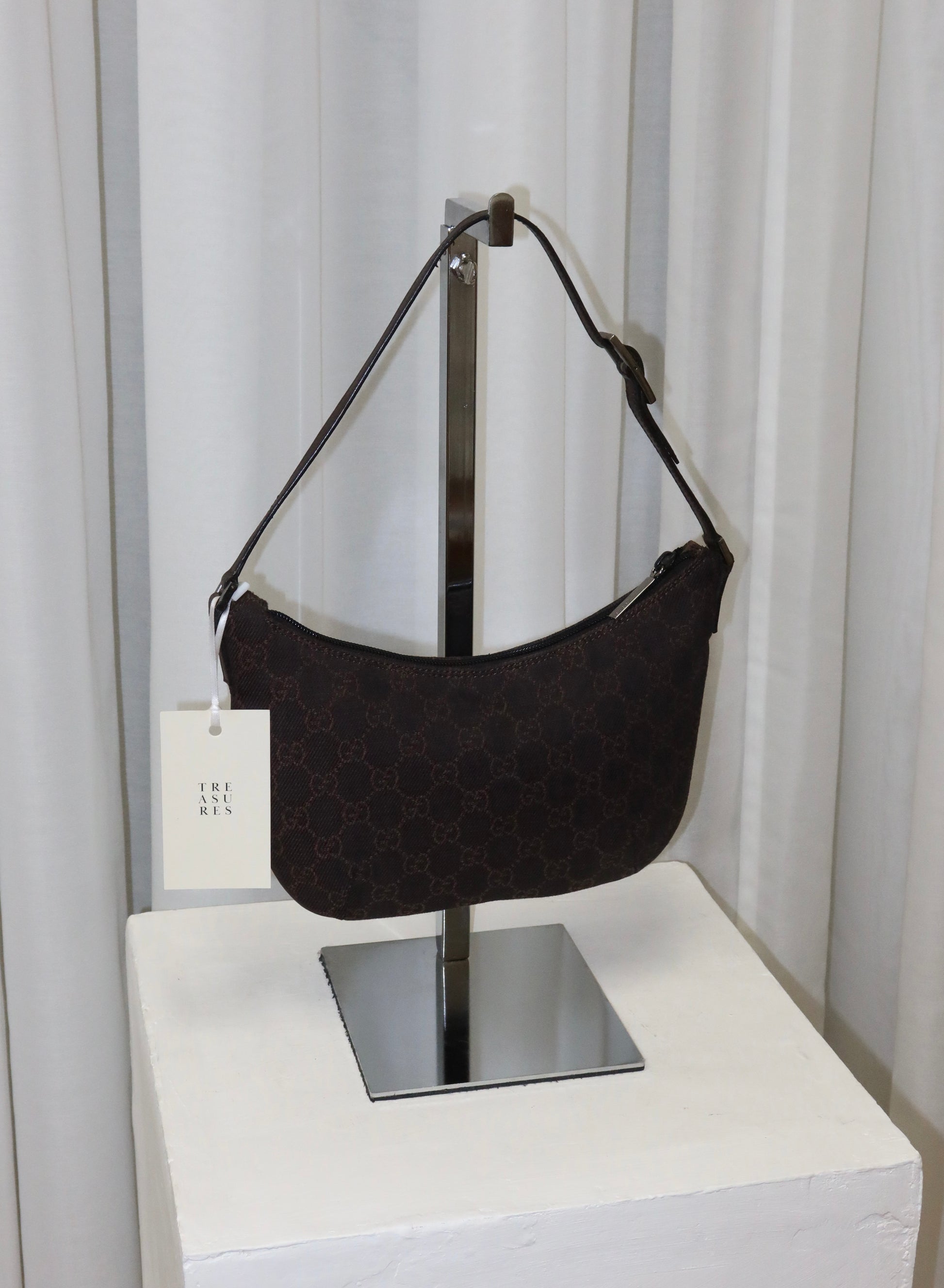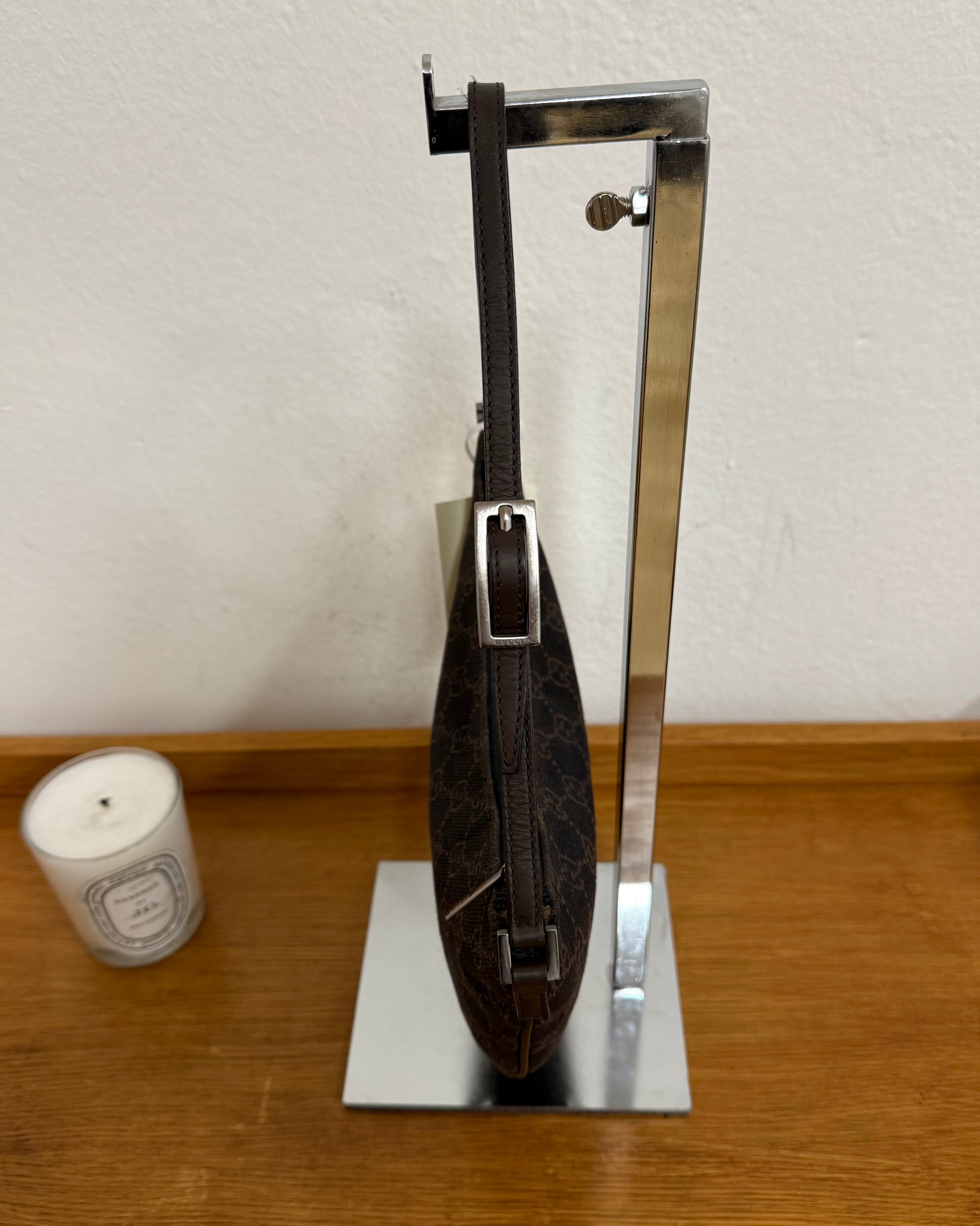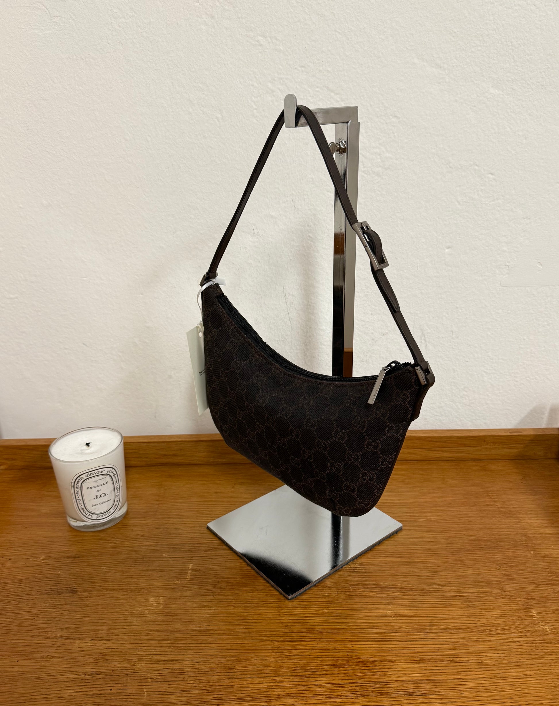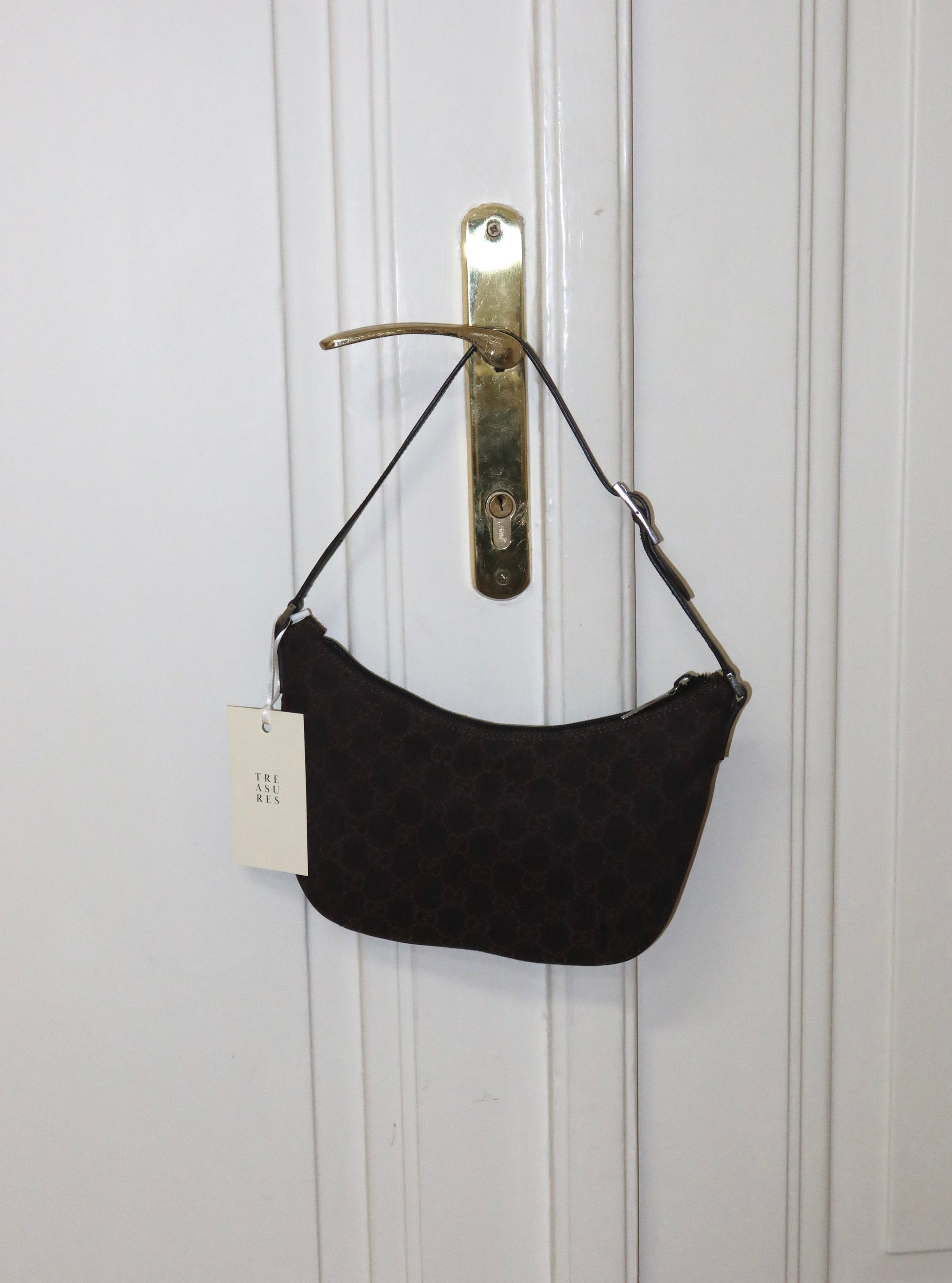 Gucci GG monogram bag v hnědém canvasu s koženými detaily. Malá a elegantní silueta s nadčasovým charakterem. Perfektní velikost na telefon, peněženku a pár drobností. Skvěle funguje jak ke každodenním outfitům, tak i na večerní příležitosti.