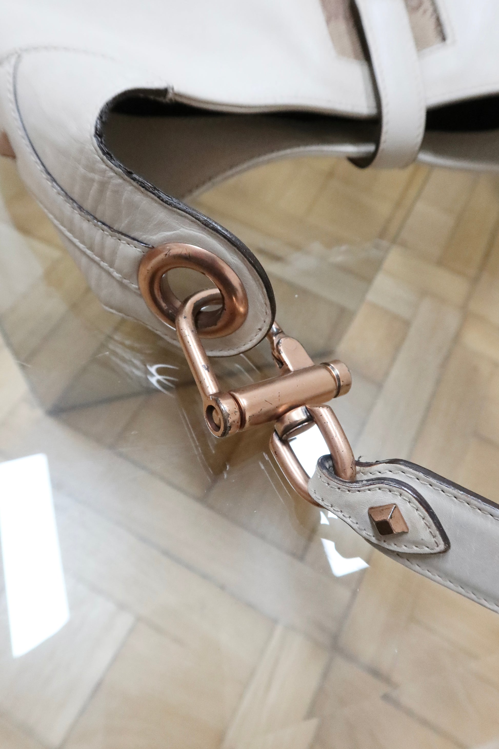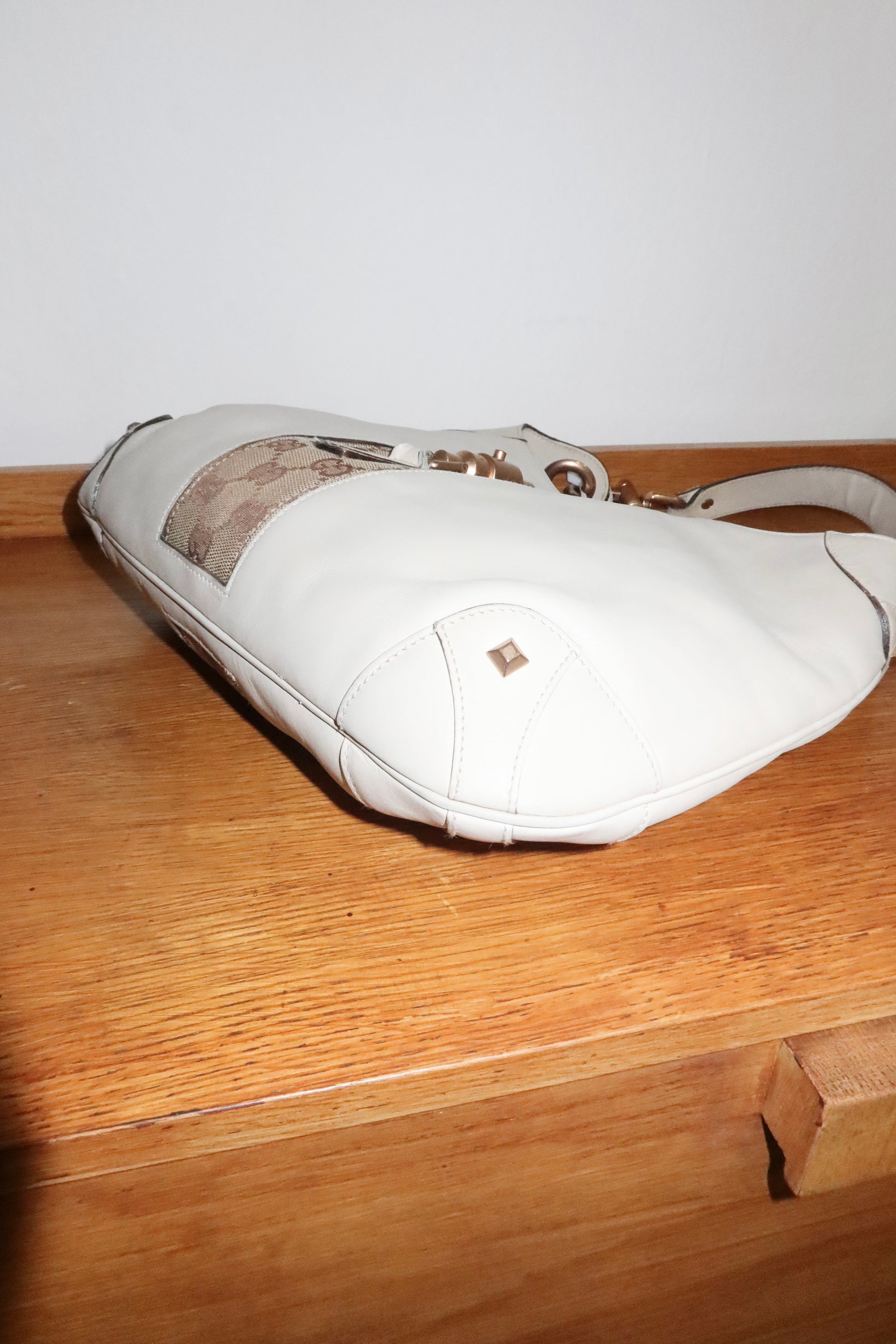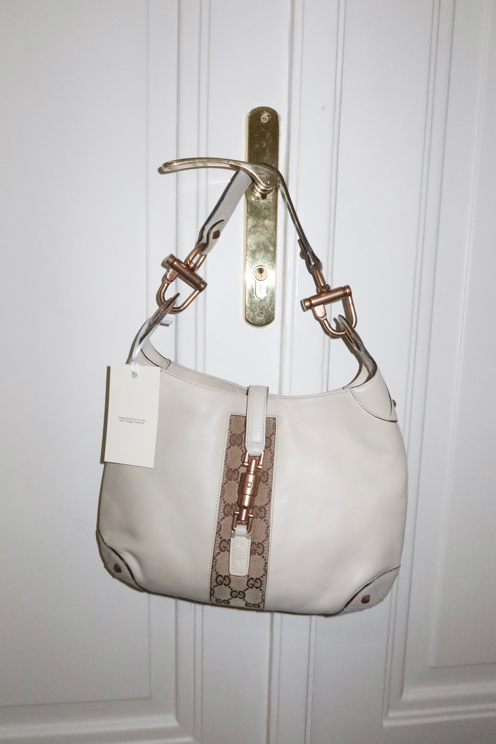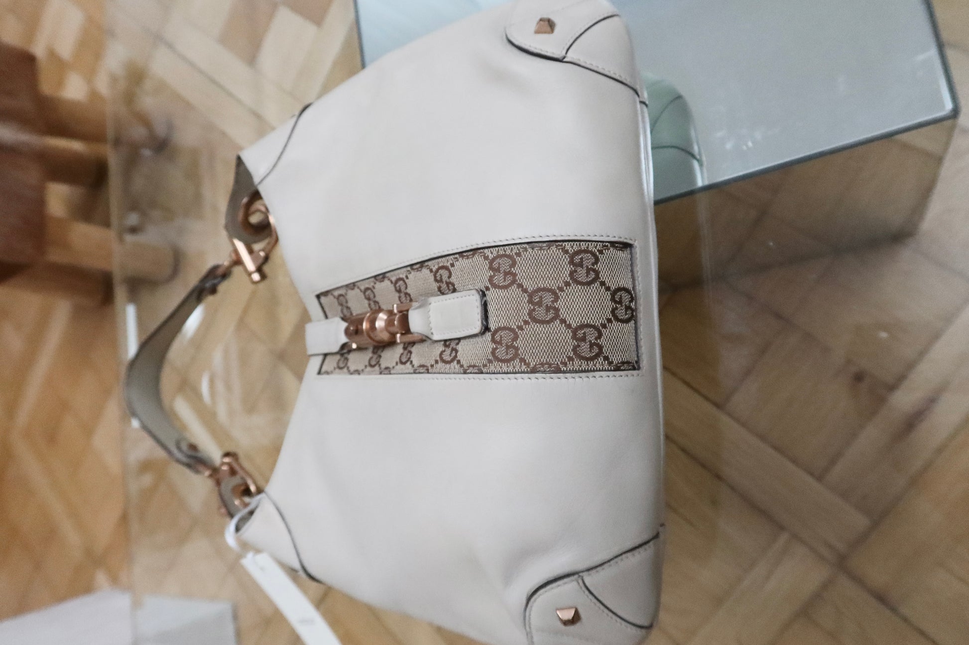 Klasická Gucci Jackie 1961 v krémové kůži s nenápadným GG monogram canvasem.