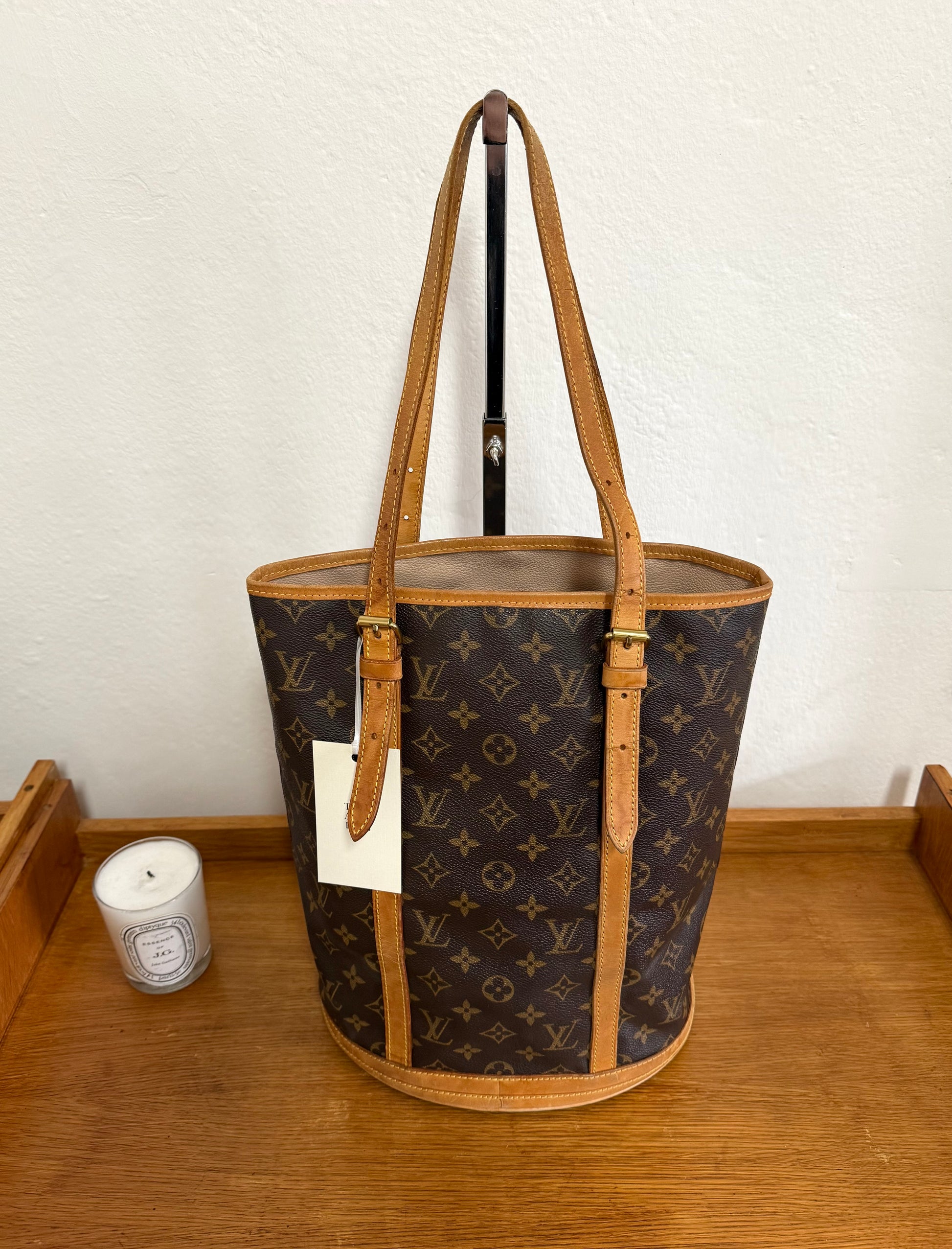 Klasická Louis Vuitton Bucket bag GM v ikonickém monogram canvasu. Velká a praktická ideální na každodenní nošení, do práce i na cestování – bez problému pojme vše potřebné.