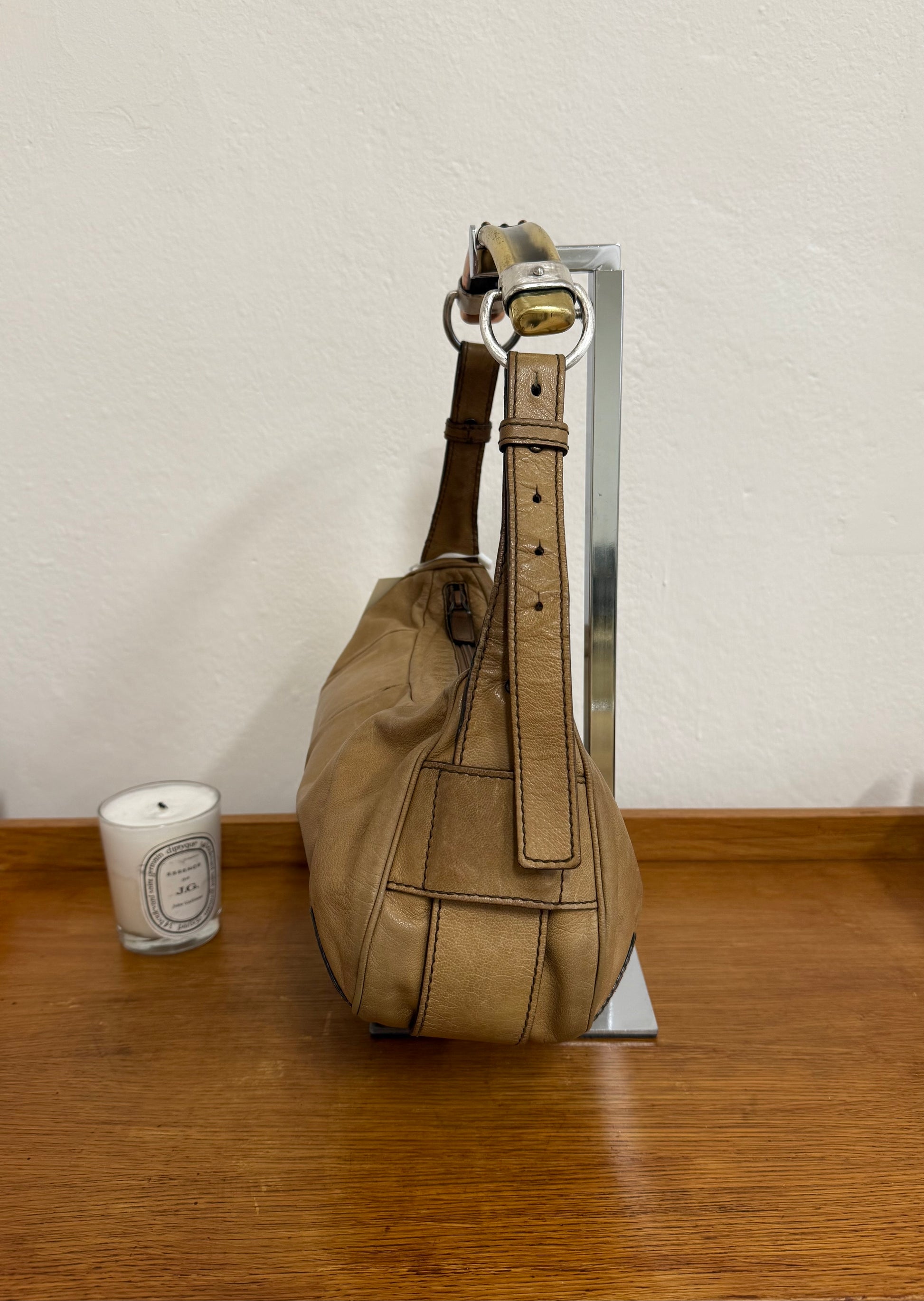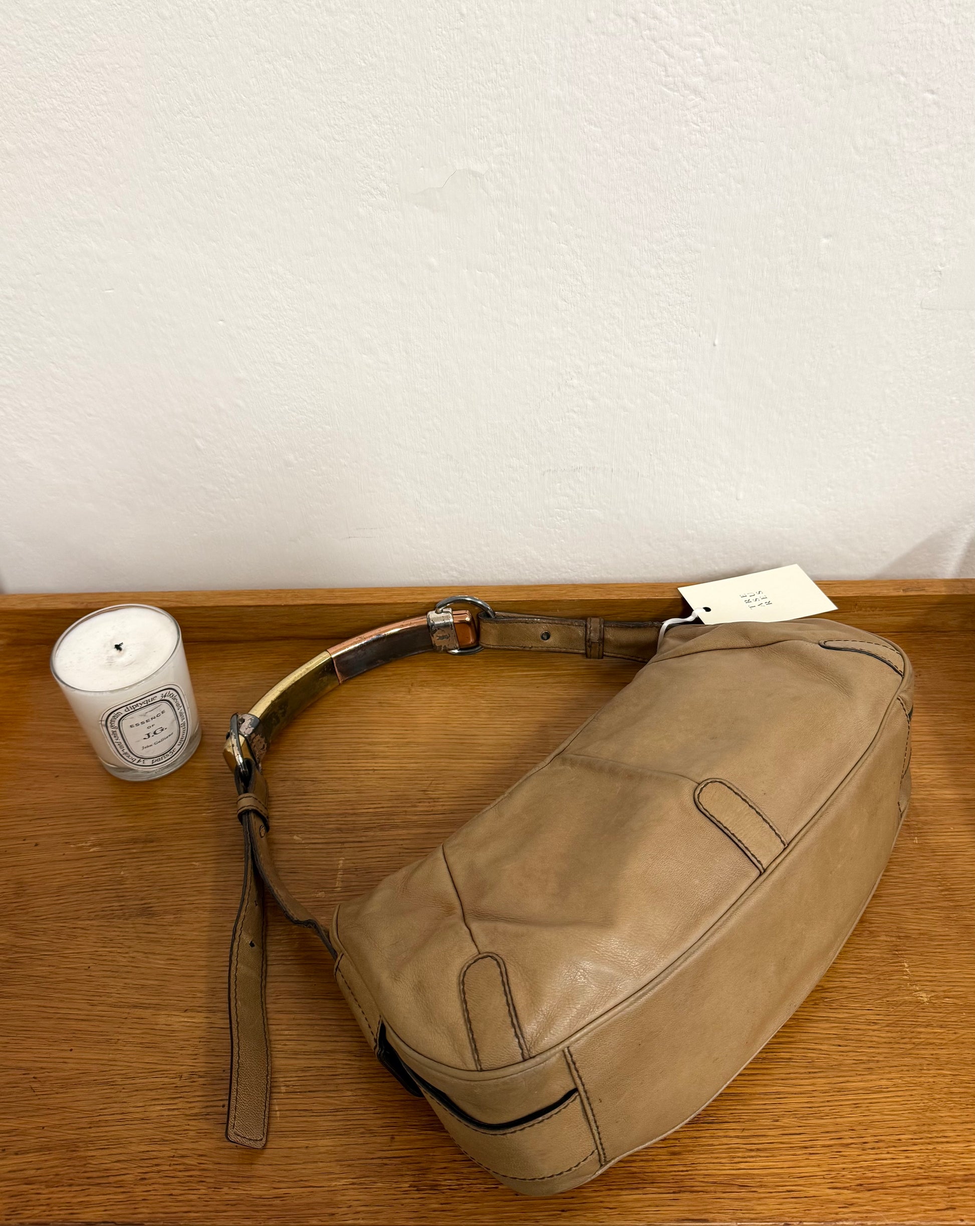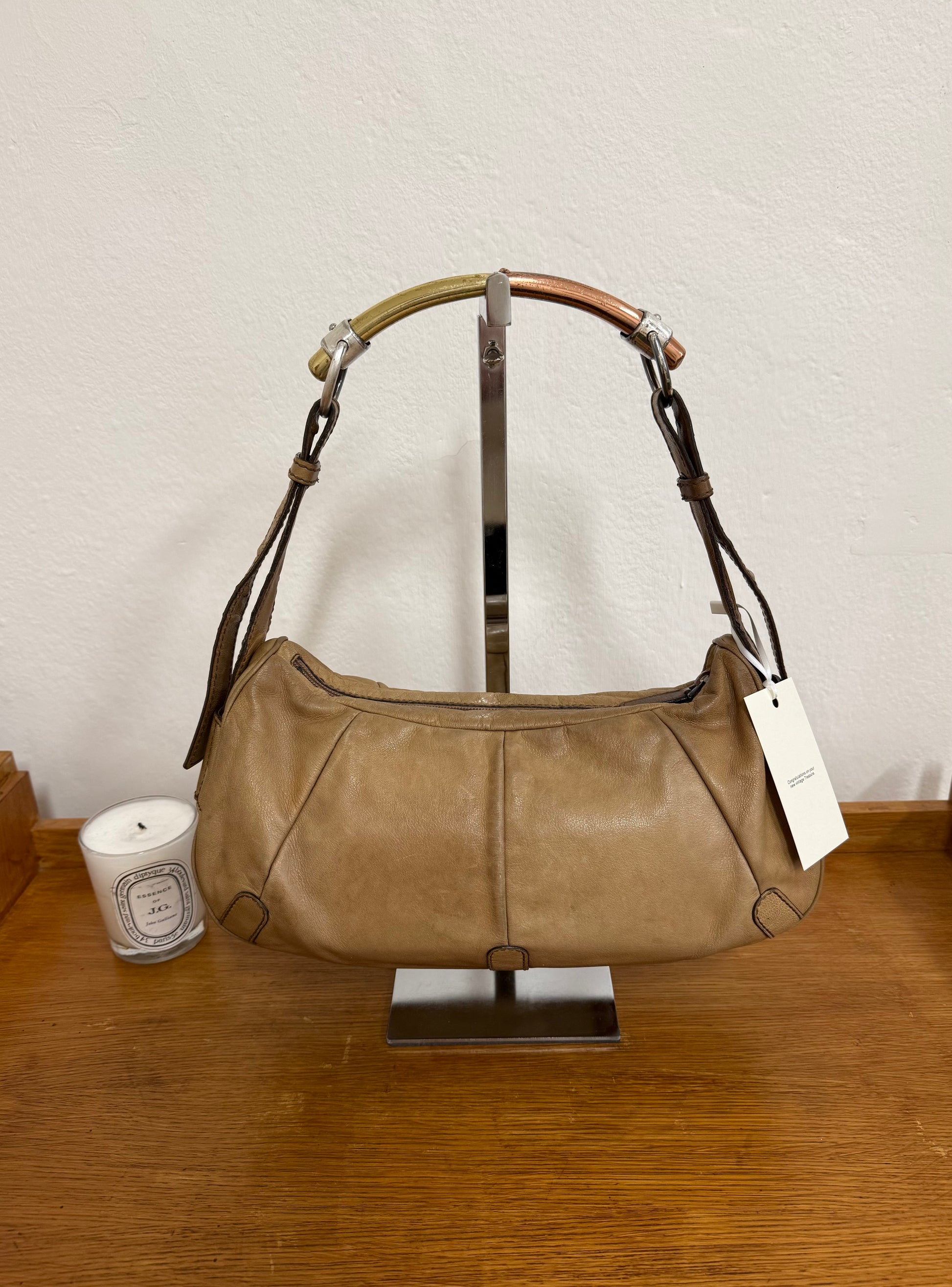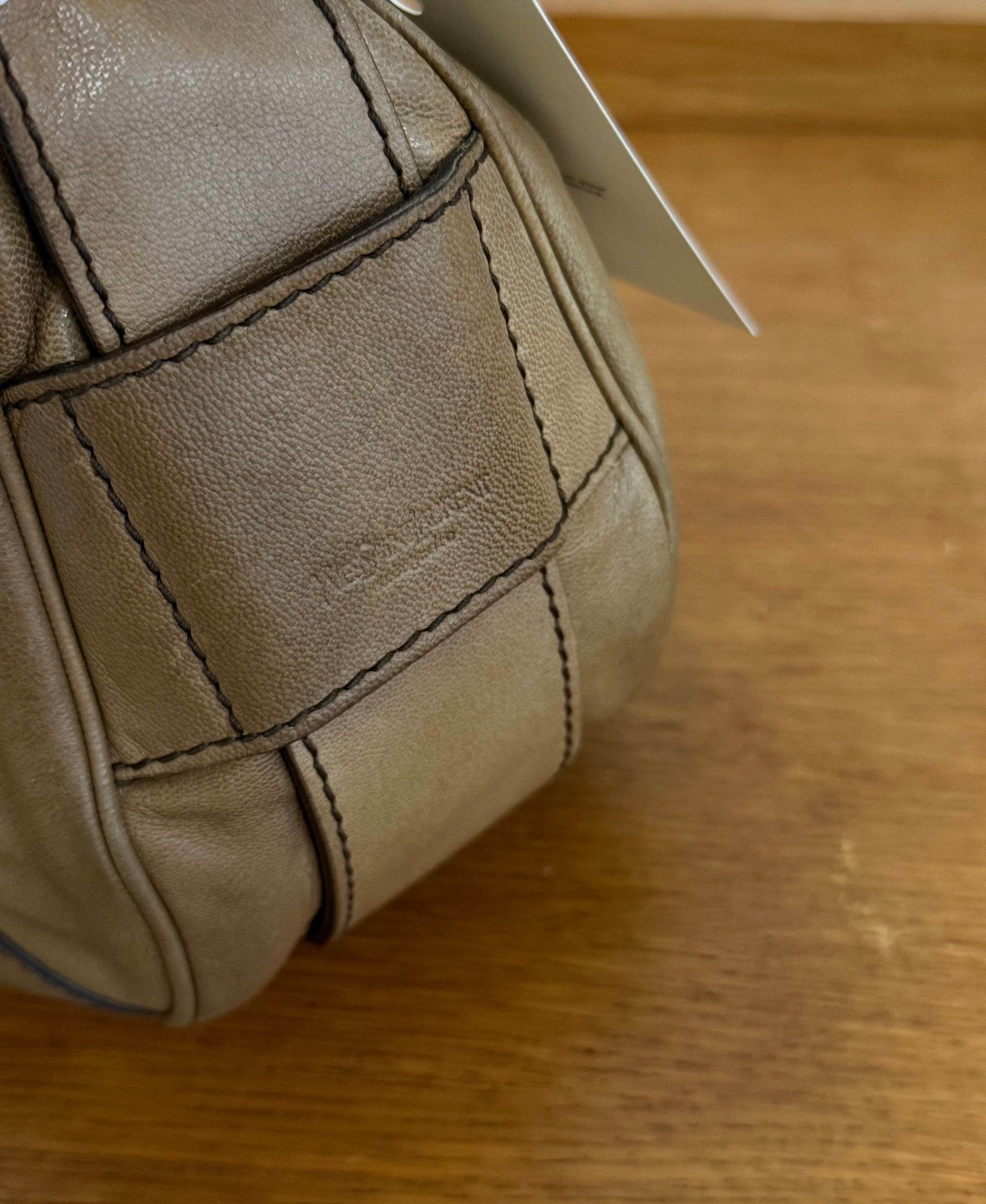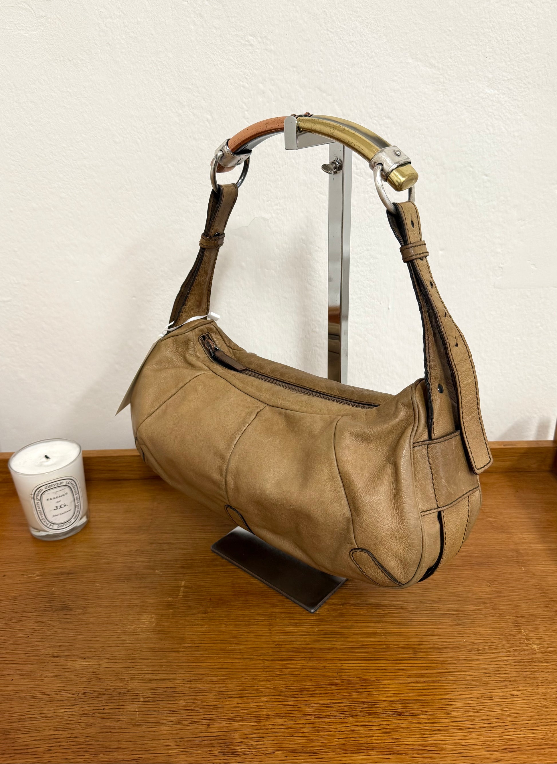 Vintage Yves Saint Laurent Mombasa shoulder bag v trikolorním metalickém provedení v béžové barvě. Ikonická kabelka patří k nejvýraznějším modelům značky. Zajímavý a výrazný model ideální na denní nošení – praktická velikost pohodlně pojme všechny nezbytnosti a kabelka tak funguje jako stylový, ale přirozený doplněk každodenních outfitů.
